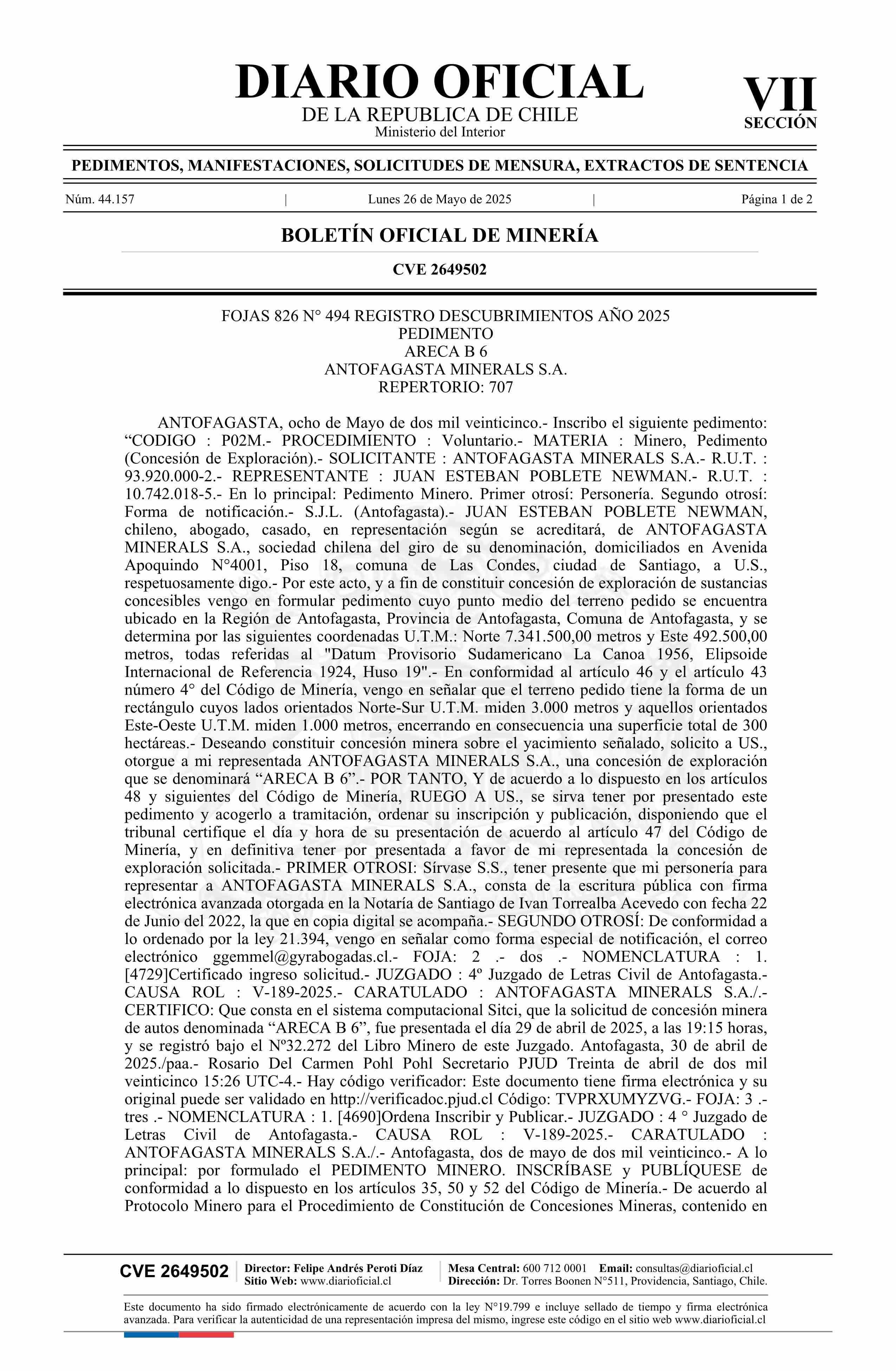 ARECA B 6 / Antofagasta Minerals S.A. 26-05-2025 DIARIO OFICIAL CHILE - BOLETÍN OFICIAL DE MINERÍA |