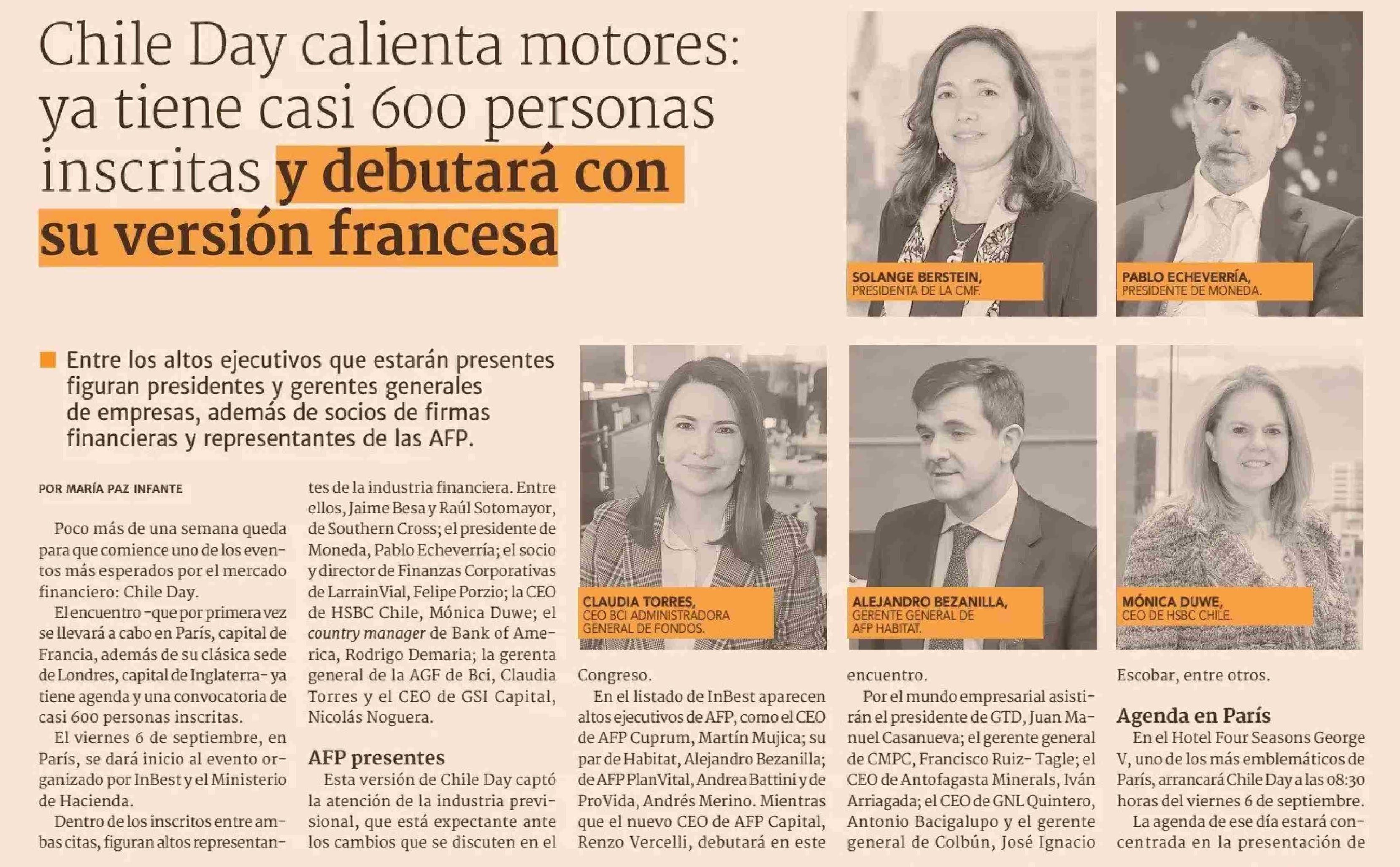Chile Day calienta motores: ya tiene casi 600 personas inscritas y debutará con su versión francesa 28-08-2024 Diario Financiero |