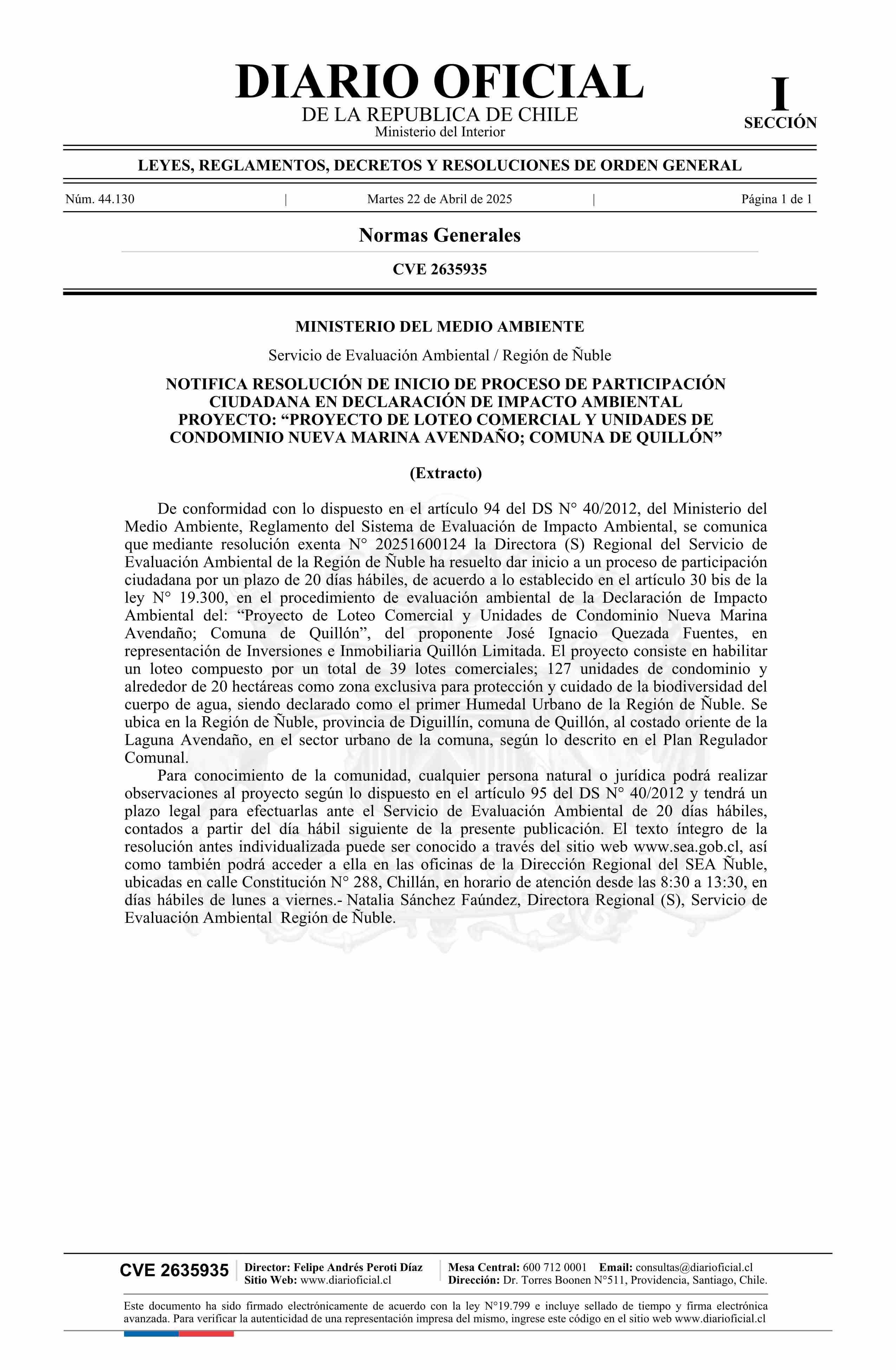 | Título: | Extracto de resolución exenta número 20251600124, de 2025.- Inicia proceso de participación ciudadana en Declaración de Impacto Ambiental del Proyecto de Loteo Comercial y Unidades de Condominio Nueva Marina Avendaño, Comuna de Quillón |