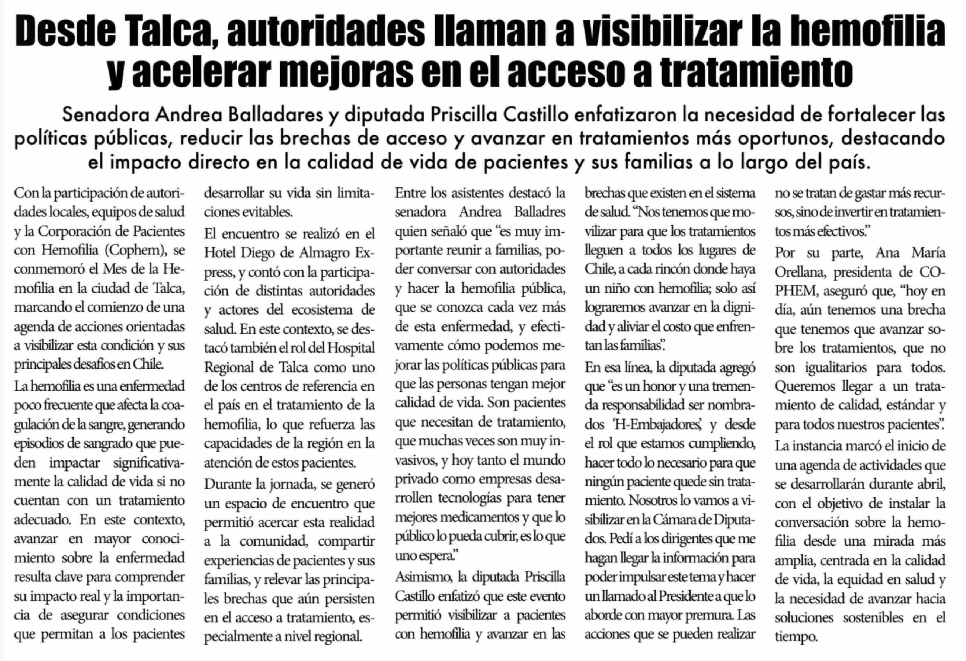 Desde Talca, autoridades llaman a visibilizar la hemofilia y acelerar mejoras en el acceso a tratamiento 25-04-2026 El Lector |