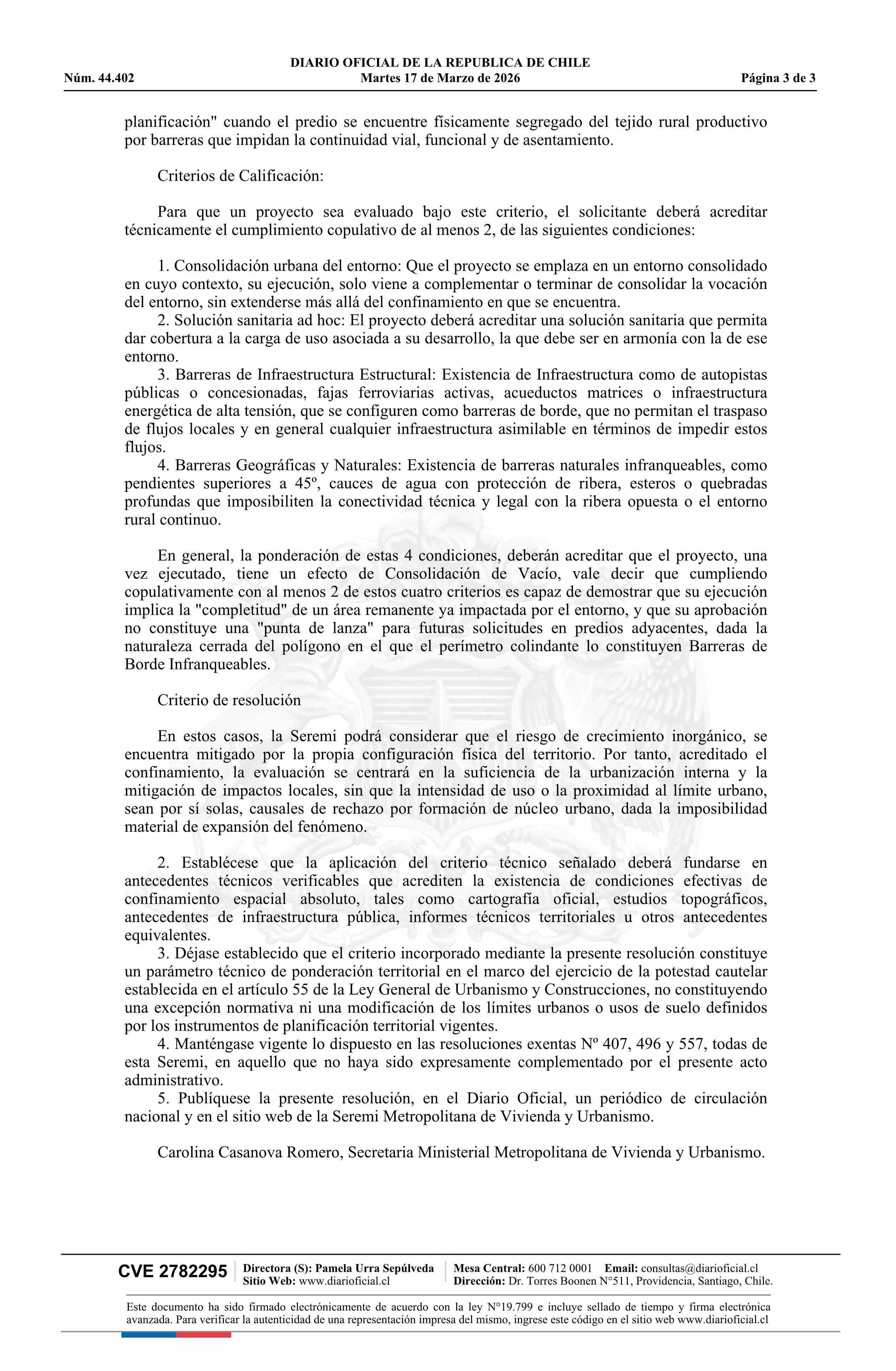 Resolución exenta número 346, de 2026.- Precisa criterios técnicos de evaluación territorial para la aplicación del artículo 55 de la Ley General de Urbanismo y Construcciones en situaciones de confinamiento espacial absoluto en la Macrozona del Valle de la Región Metropolitana y complementa resoluc