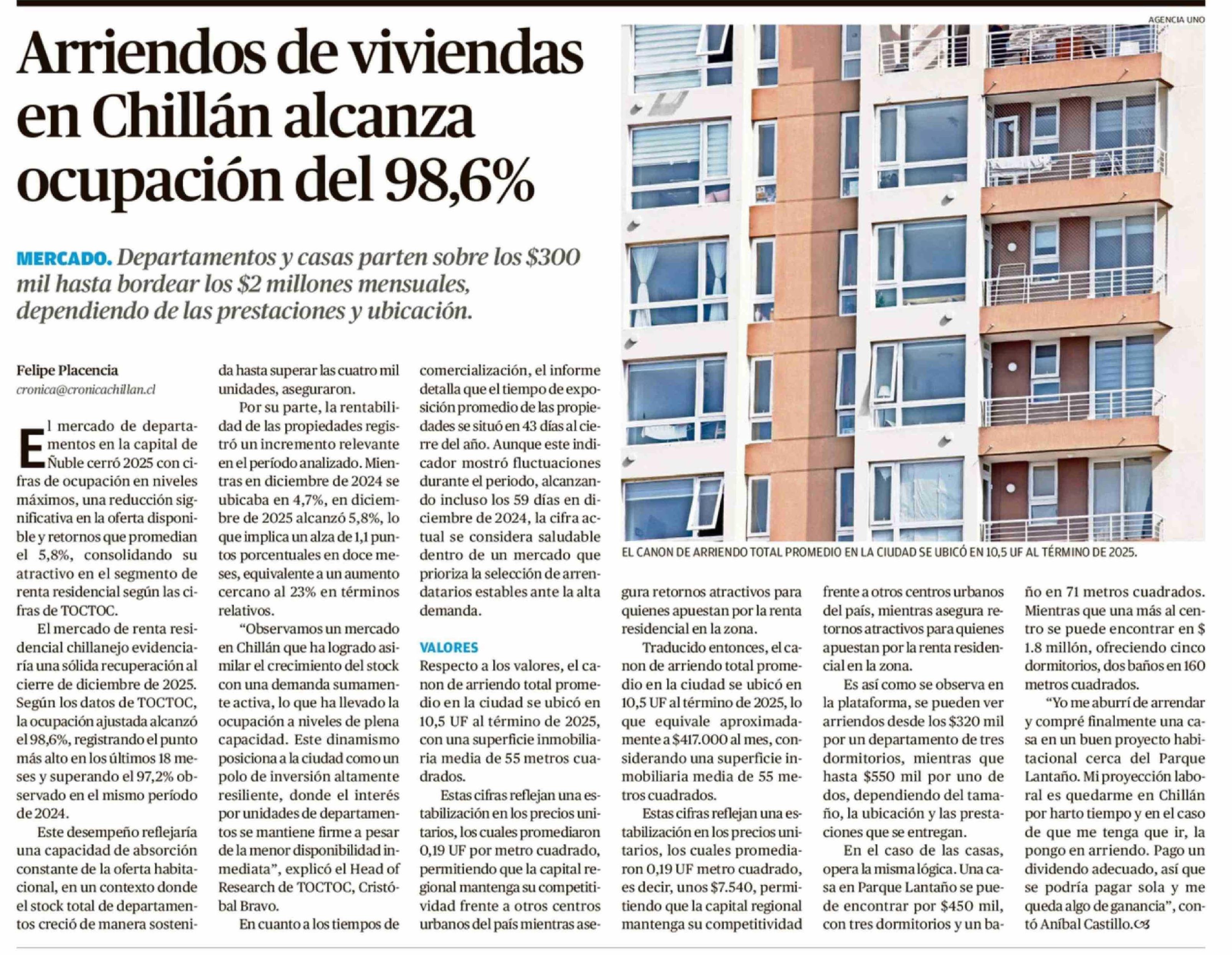 Título: Arriendos de viviendas en Chillán alcanza ocupación del 98,6%