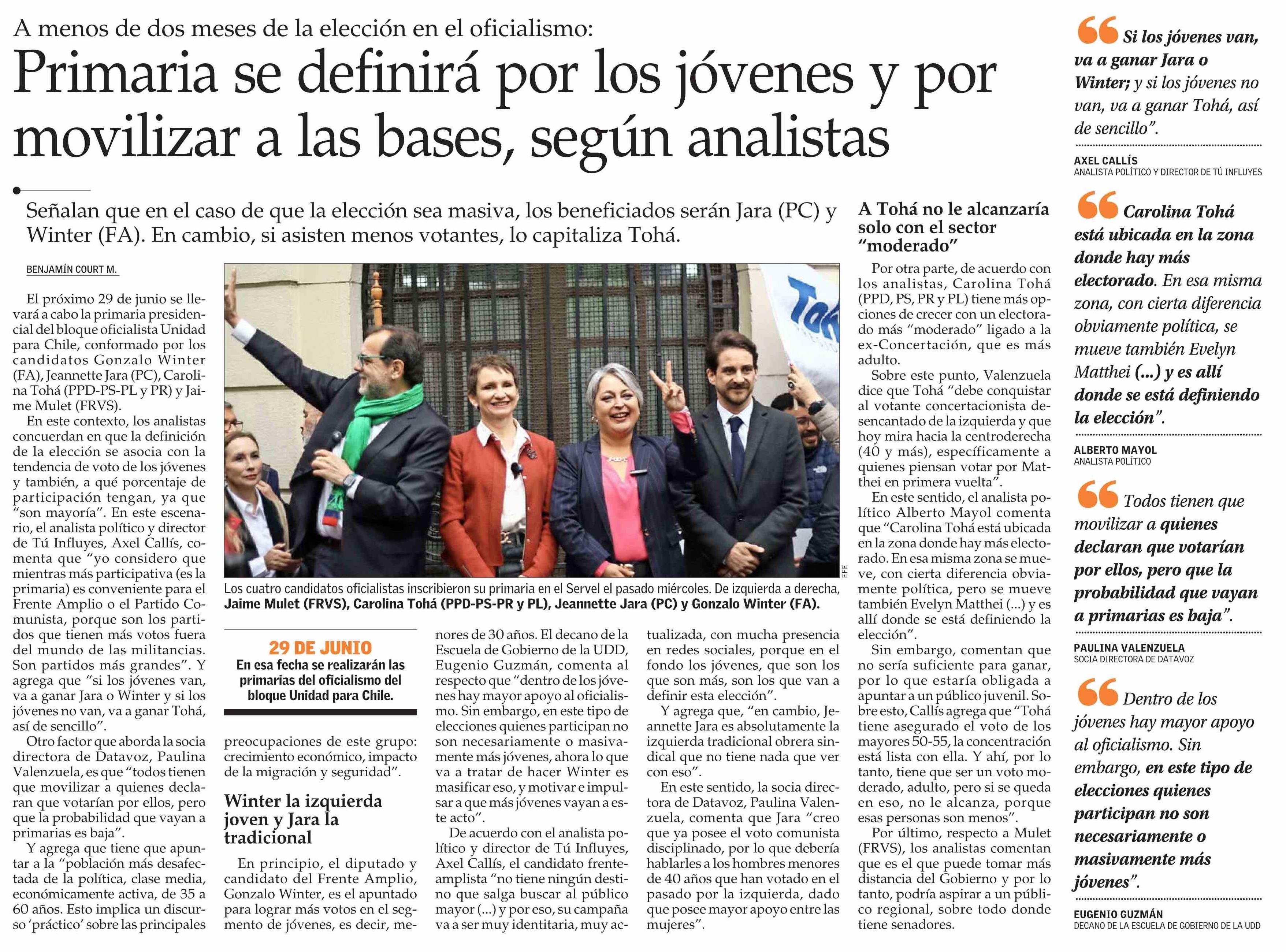 Primaria se definirá por los jóvenes y por movilizar a las bases, según analistas 04-05-2025 El Mercurio |
