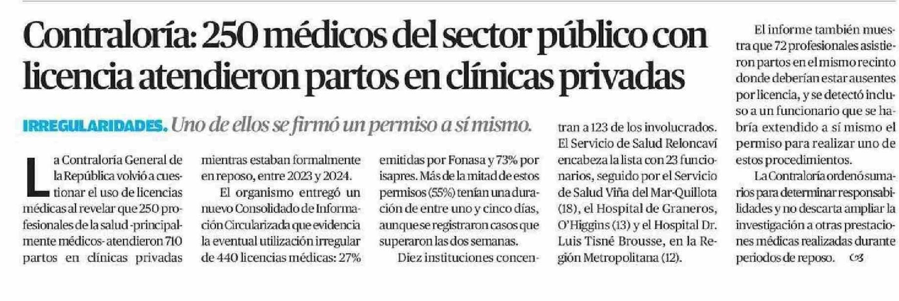 Contraloría: 250 médicos del sector público con licencia atendieron partos en clínicas privadas 24-05-2025 El Diario de Atacama |