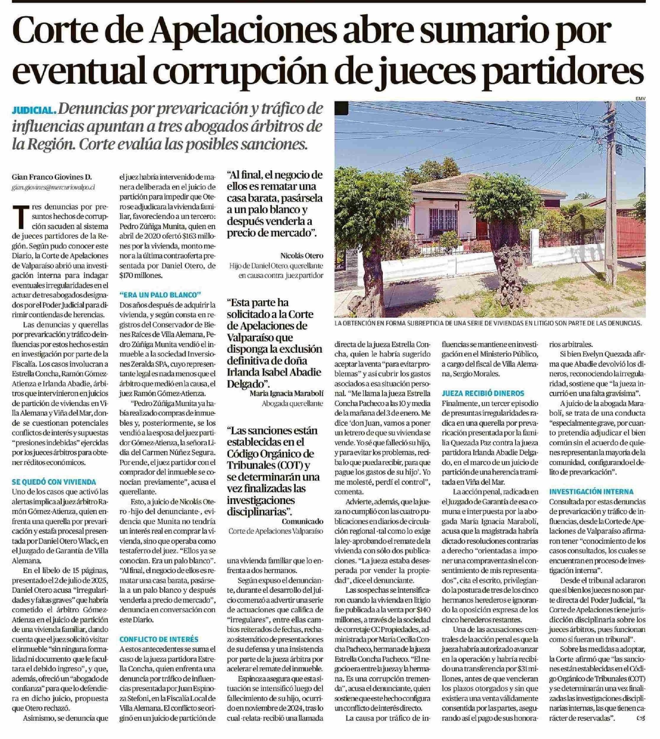 Corte de Apelaciones abre sumario por eventual corrupción de jueces partidores 10-01-2026 El Mercurio de Valparaíso |