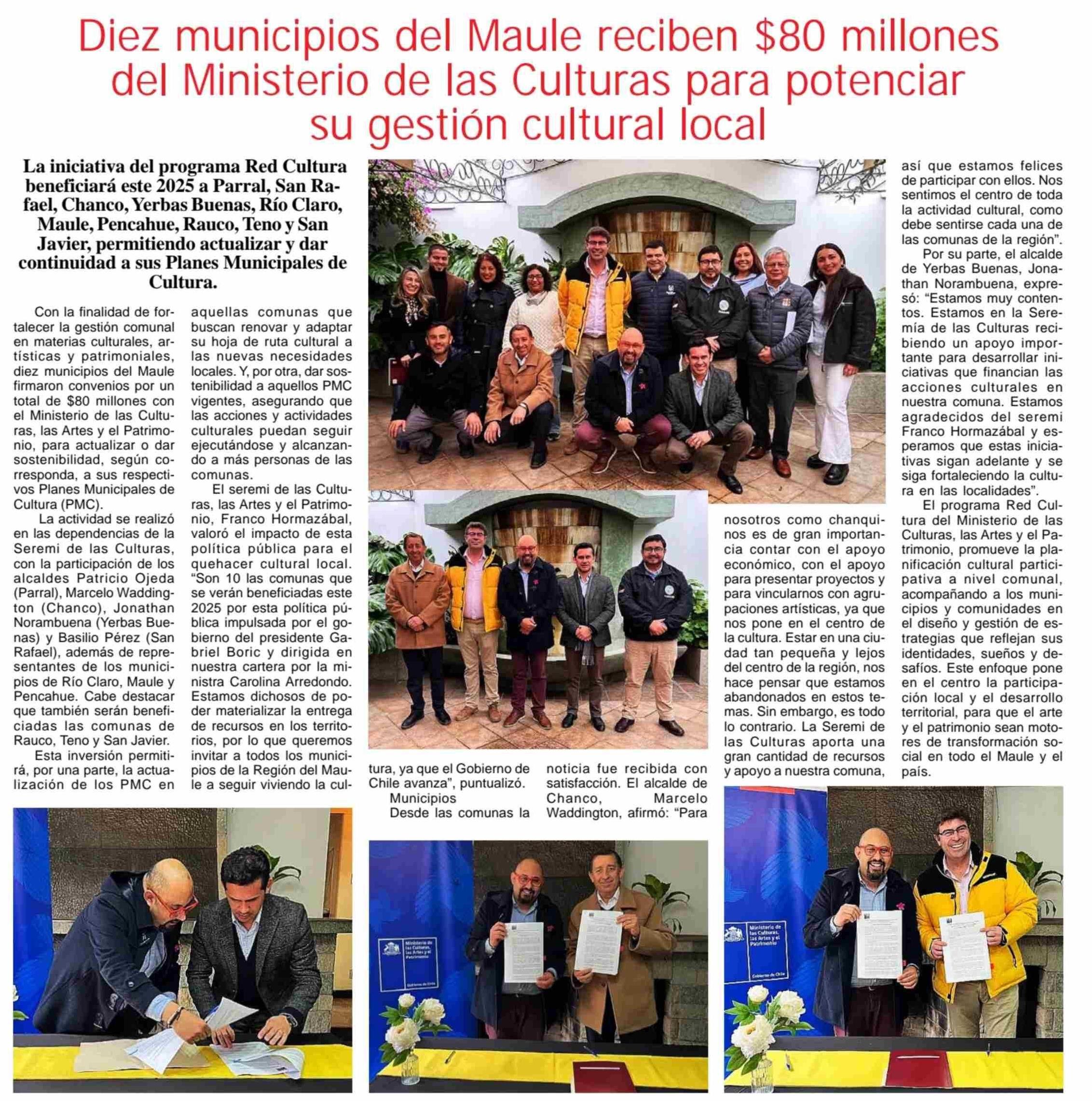 Diez municipios del Maule reciben $80 millones del Ministerio de las Culturas para potenciar su gestión cultural local 08-06-2025 Maule Hoy |