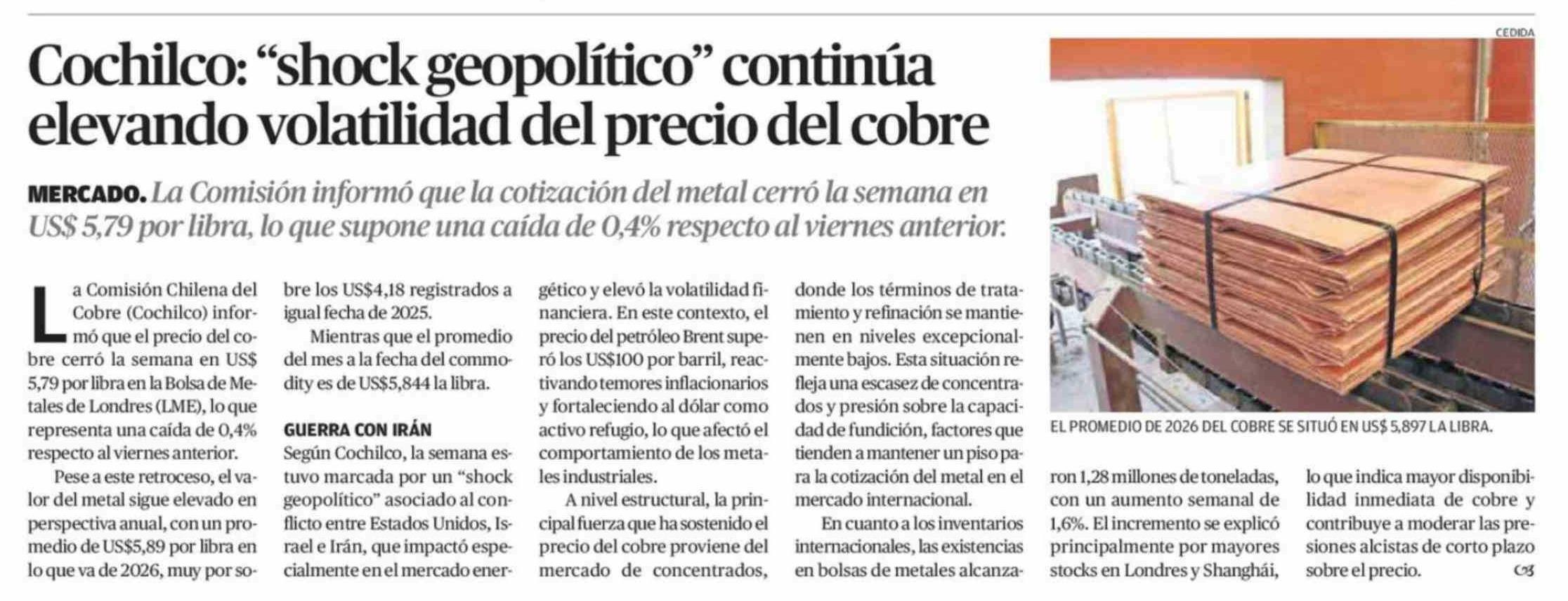 Cochilco: "shock geopolítico" continúa elevando volatilidad del precio del cobre 14-03-2026 El Mercurio de Calama |