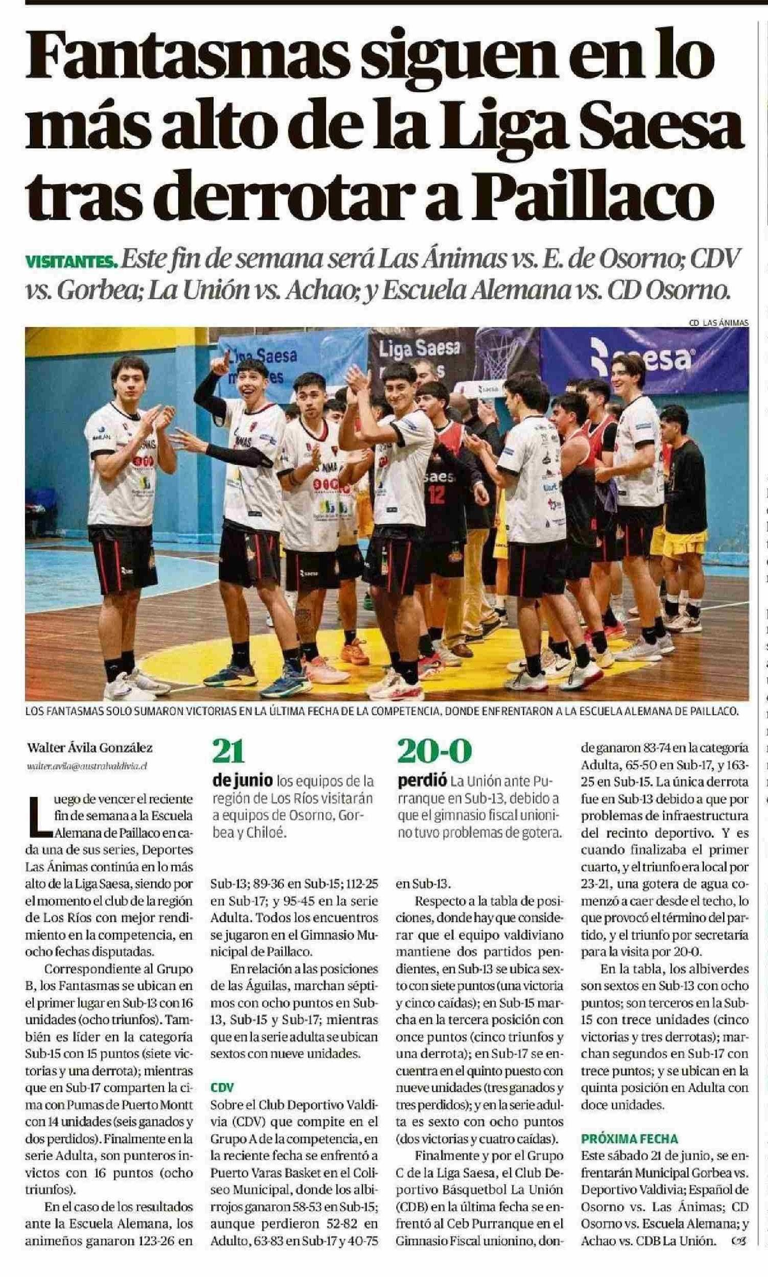 Fantasmas siguen en lo más alto de la Liga Saesa tras derrotar a Paillaco 19-06-2025 Diario Austral Región de Los Ríos |