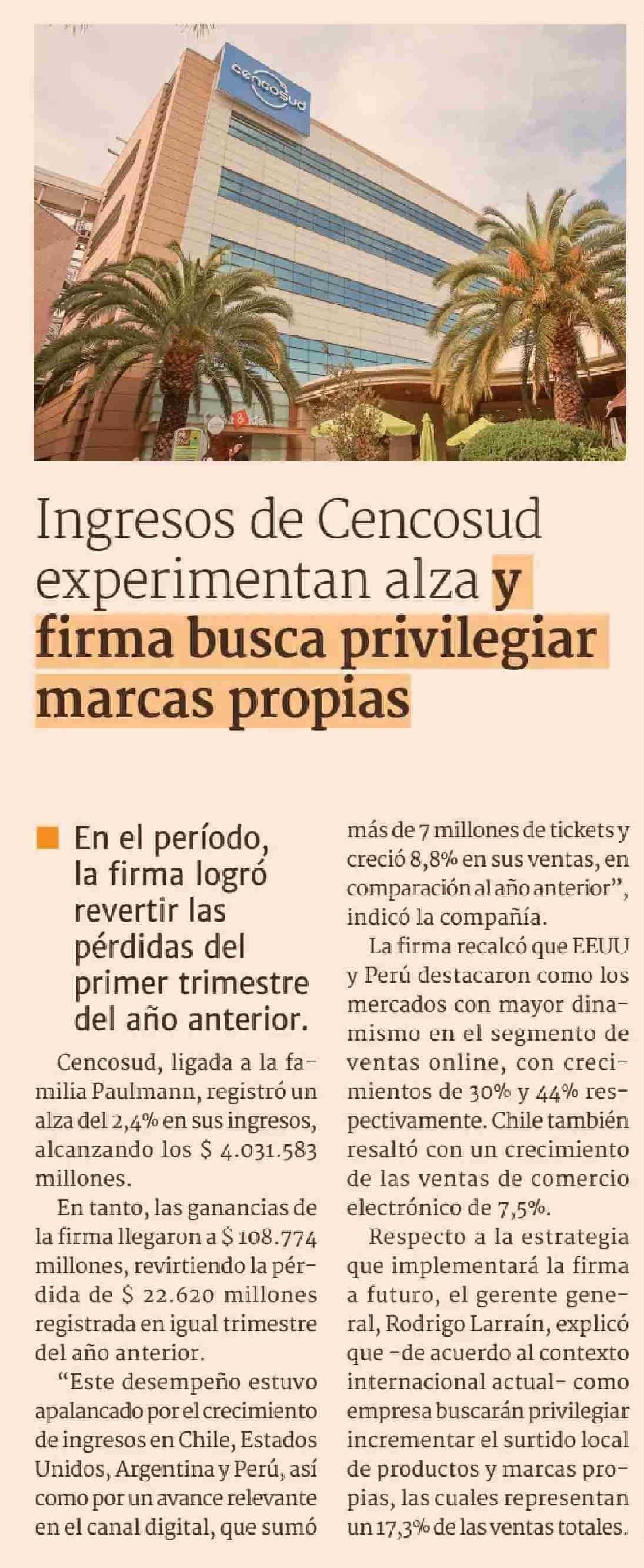 | Título: | Ingresos de Cencosud experimentan alza y firma busca privilegiar marcas propias |
