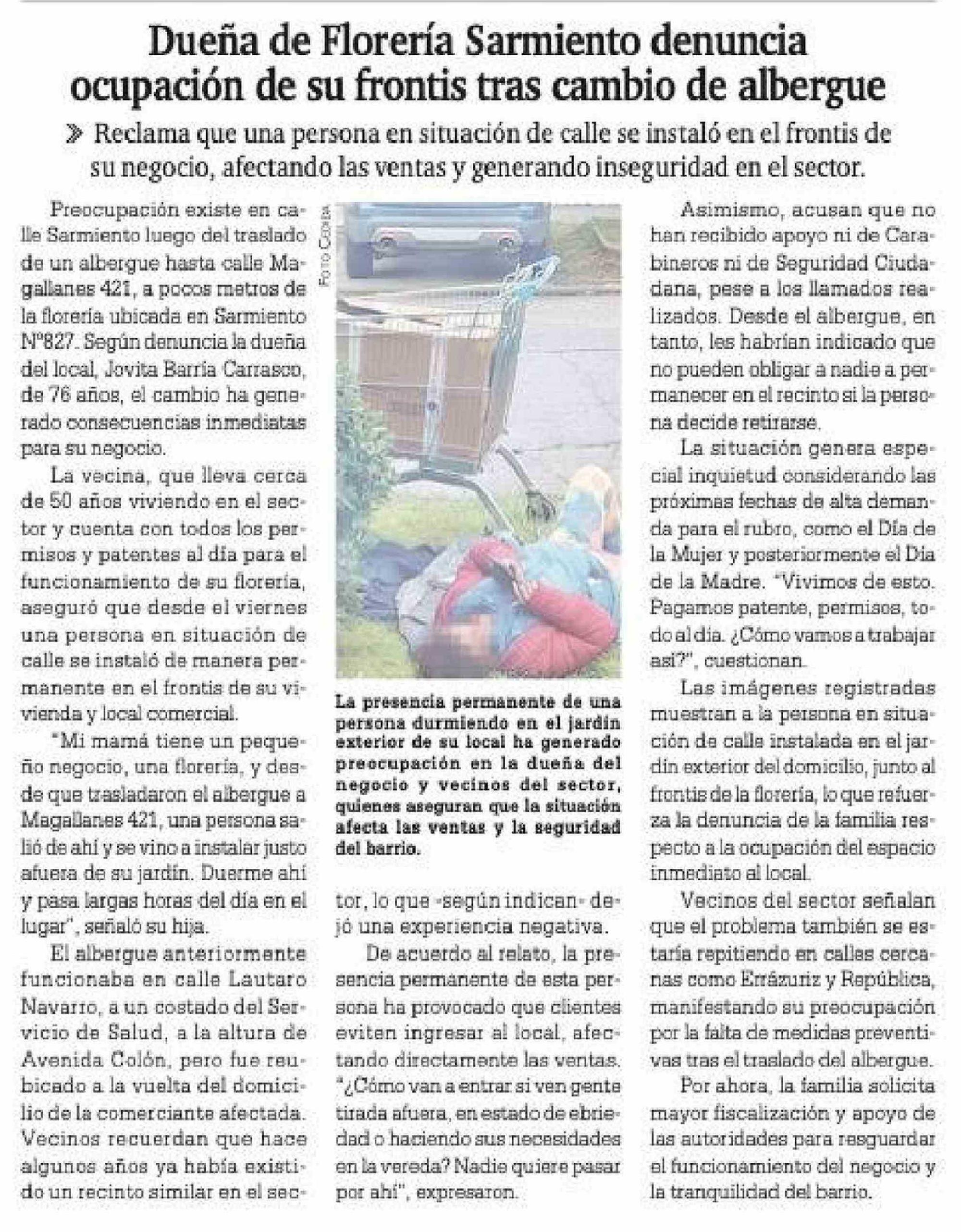 Título: Dueña de Florería Sarmiento denuncia ocupación de su frontis tras cambio de albergue