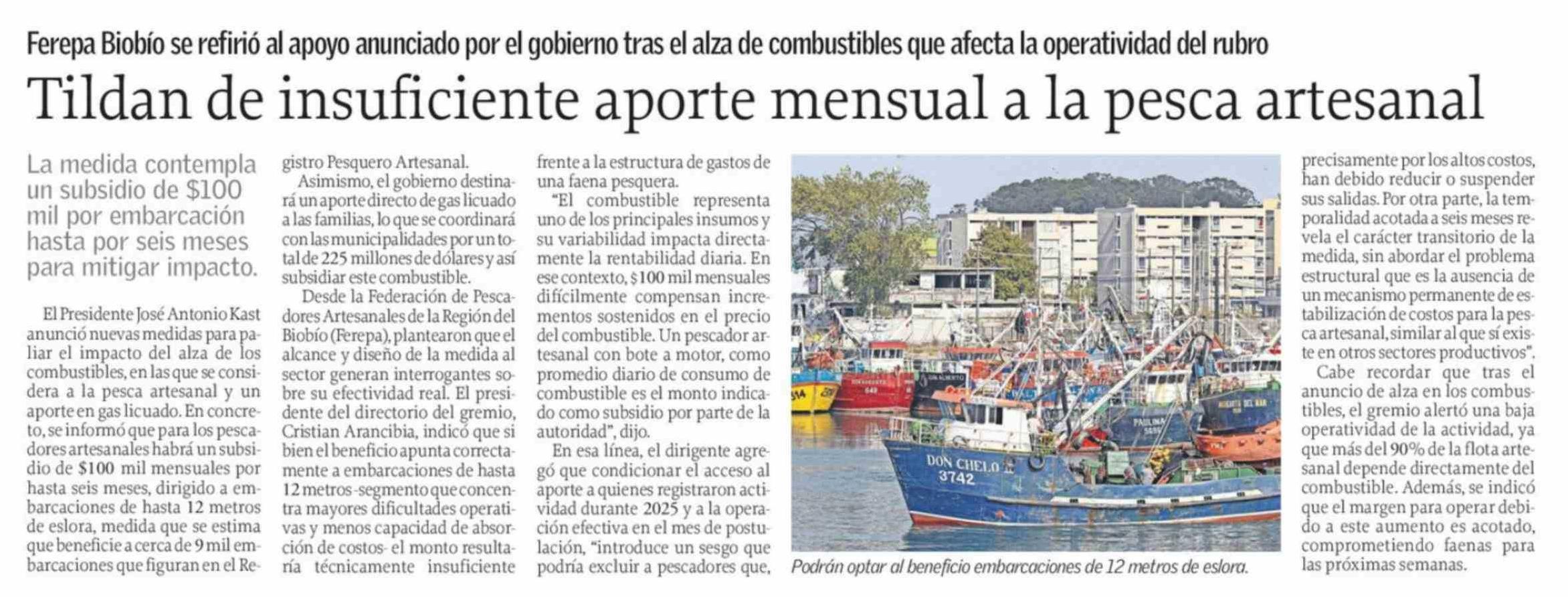 Tildan de insuficiente aporte mensual a la pesca artesanal 02-04-2026 El Sur |
