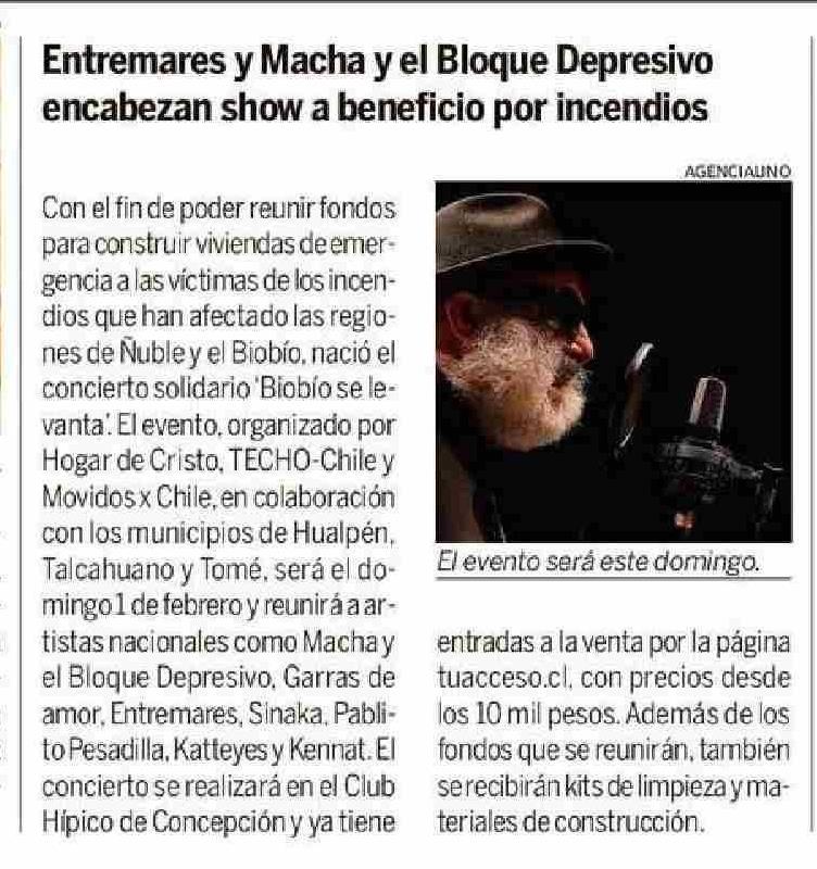 | Título: | Entremares y Macha y el Bloque Depresivo encabezan show a beneficio por incendios |