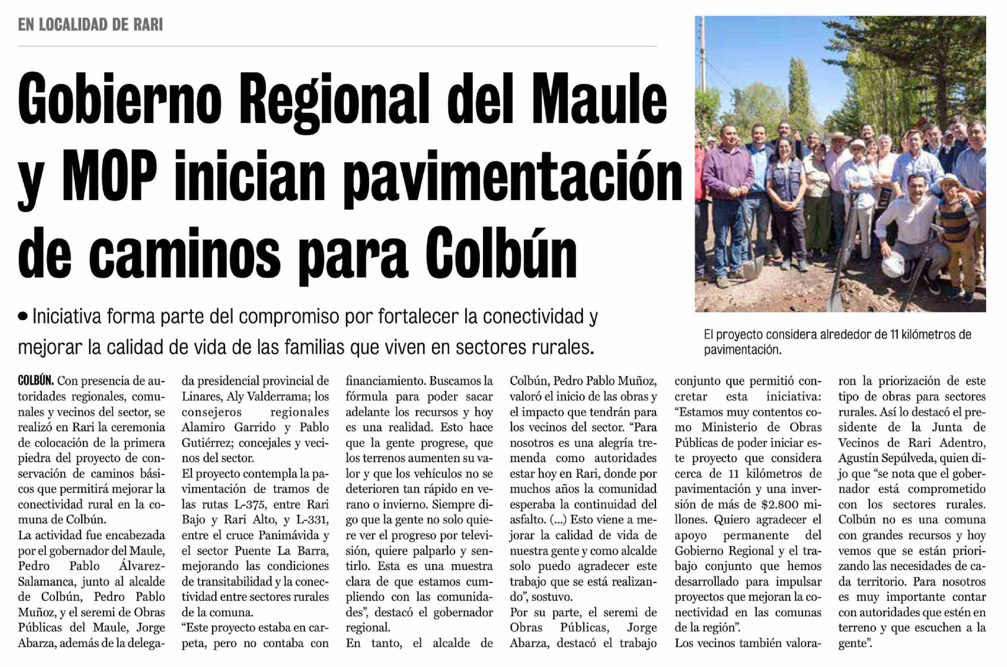 Gobierno Regional del Maule y MOP inician pavimentación de caminos para Colbún 10-03-2026 La Prensa de Curicó |