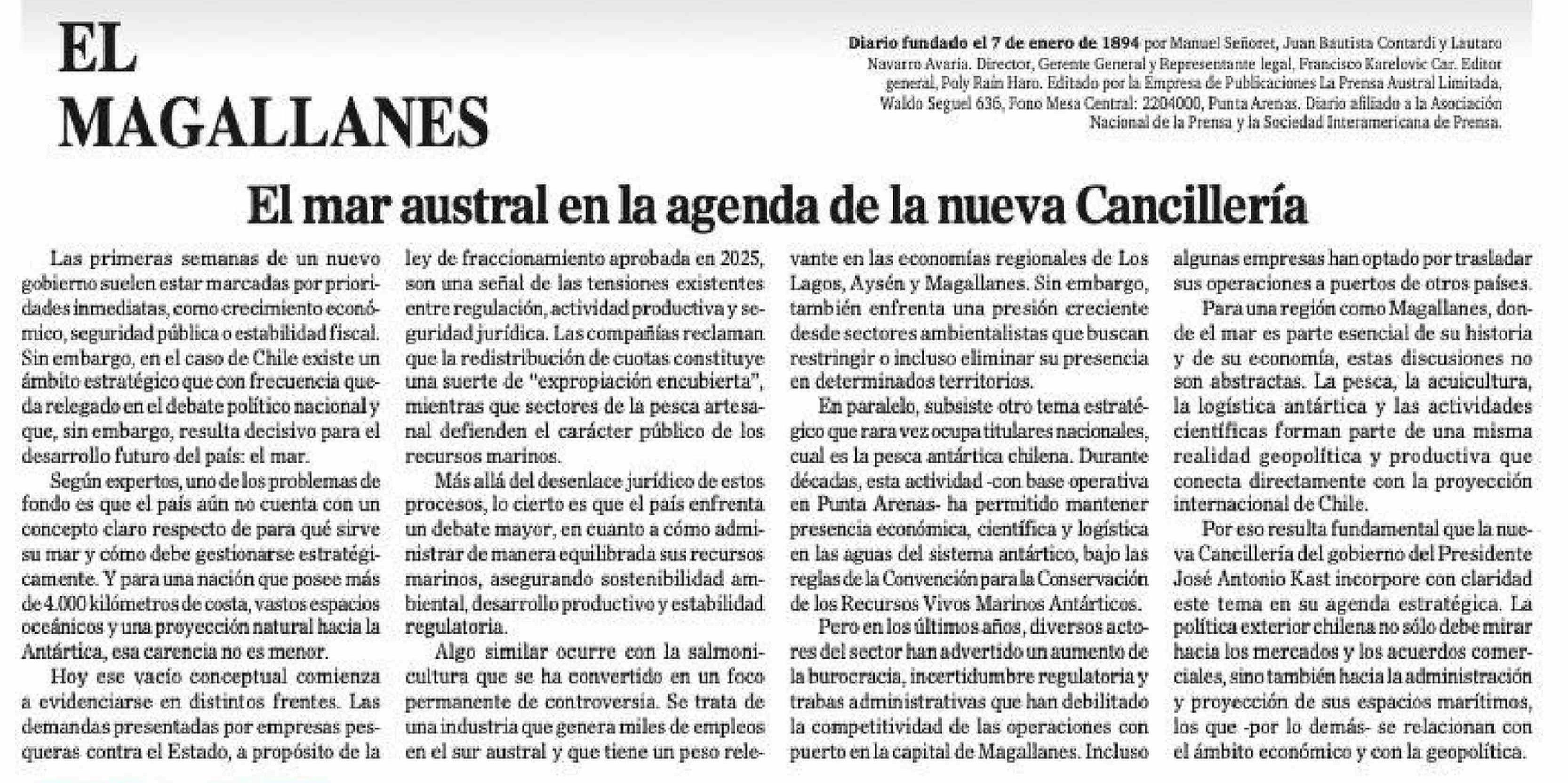 Editorial: El mar austral en la agenda de la nueva Cancillería 29-03-2026 El Magallanes |