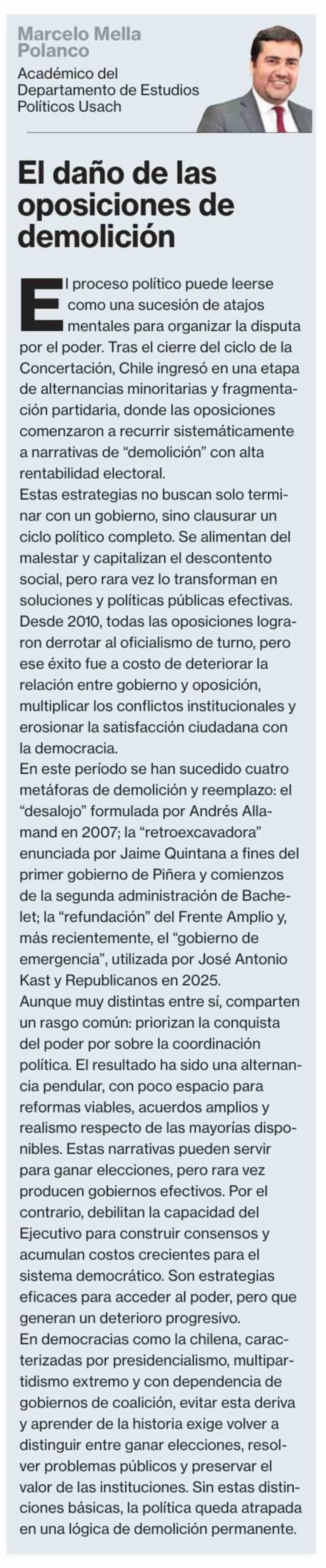 Columnas de Opinión: El daño de las oposiciones de demolición 23-02-2026 La Segunda |