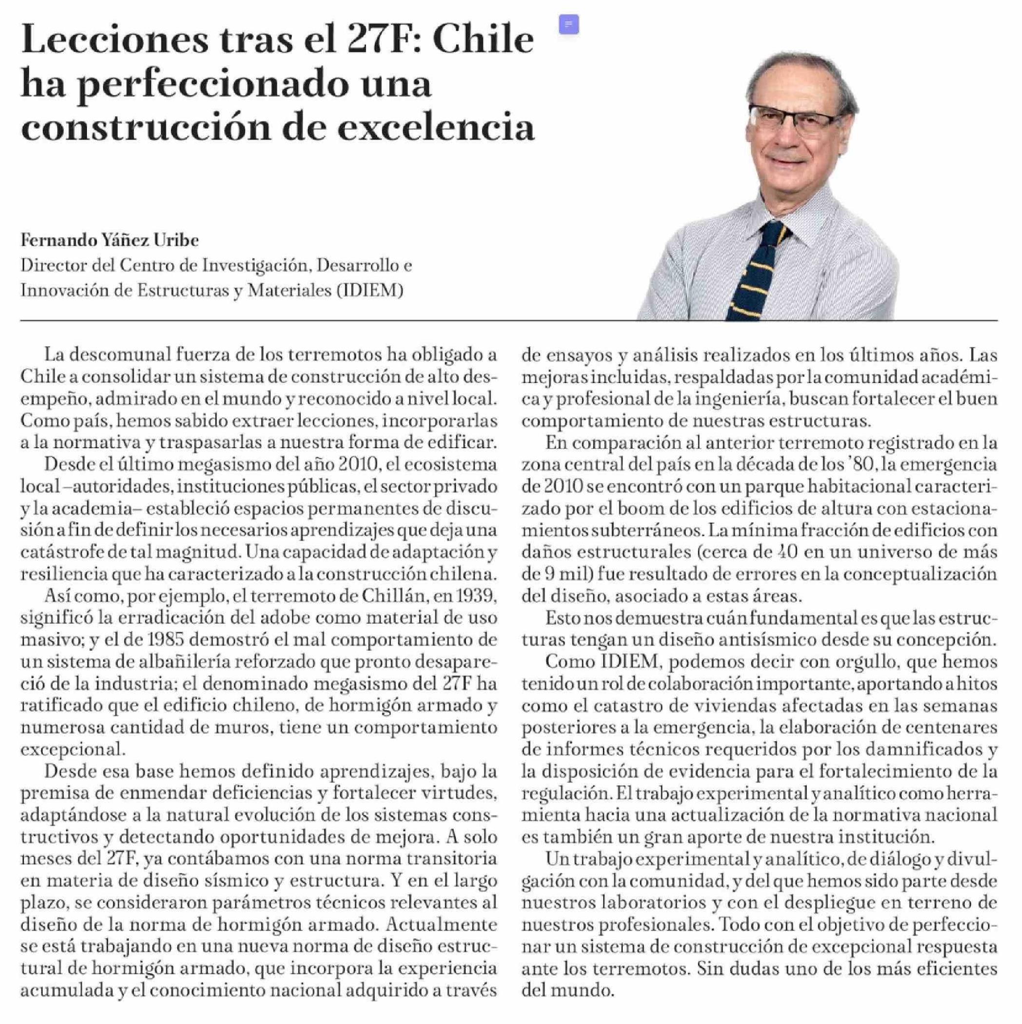 Título: Columnas de Opinión: Lecciones tras el 27F: Chile ha perfeccionado una construcción de excelencia