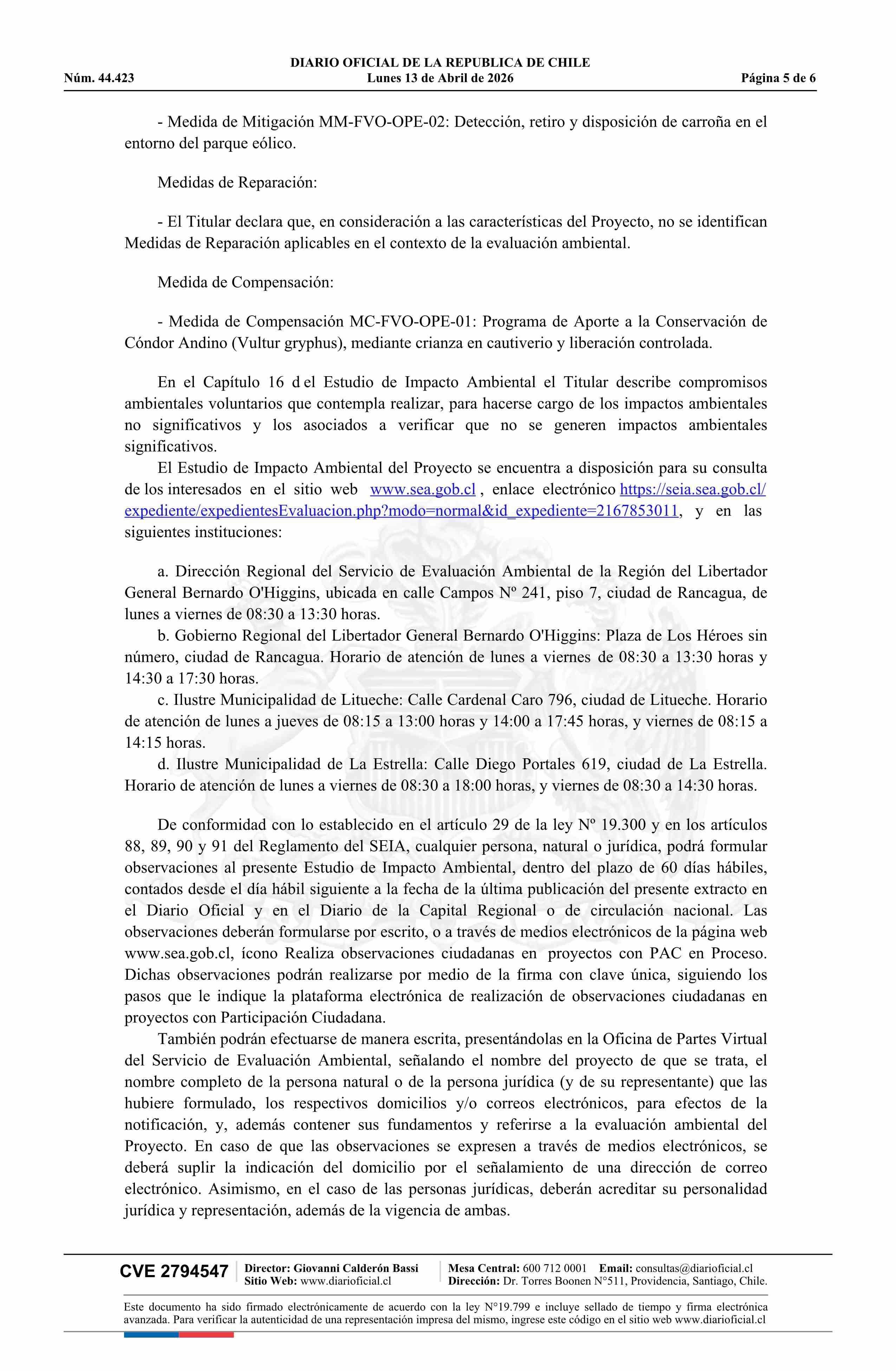 Título: Extracto de Estudio de Impacto Ambiental del proyecto Modificación Parques Eólicos Cardonal, Manantiales y Los Cerrillos