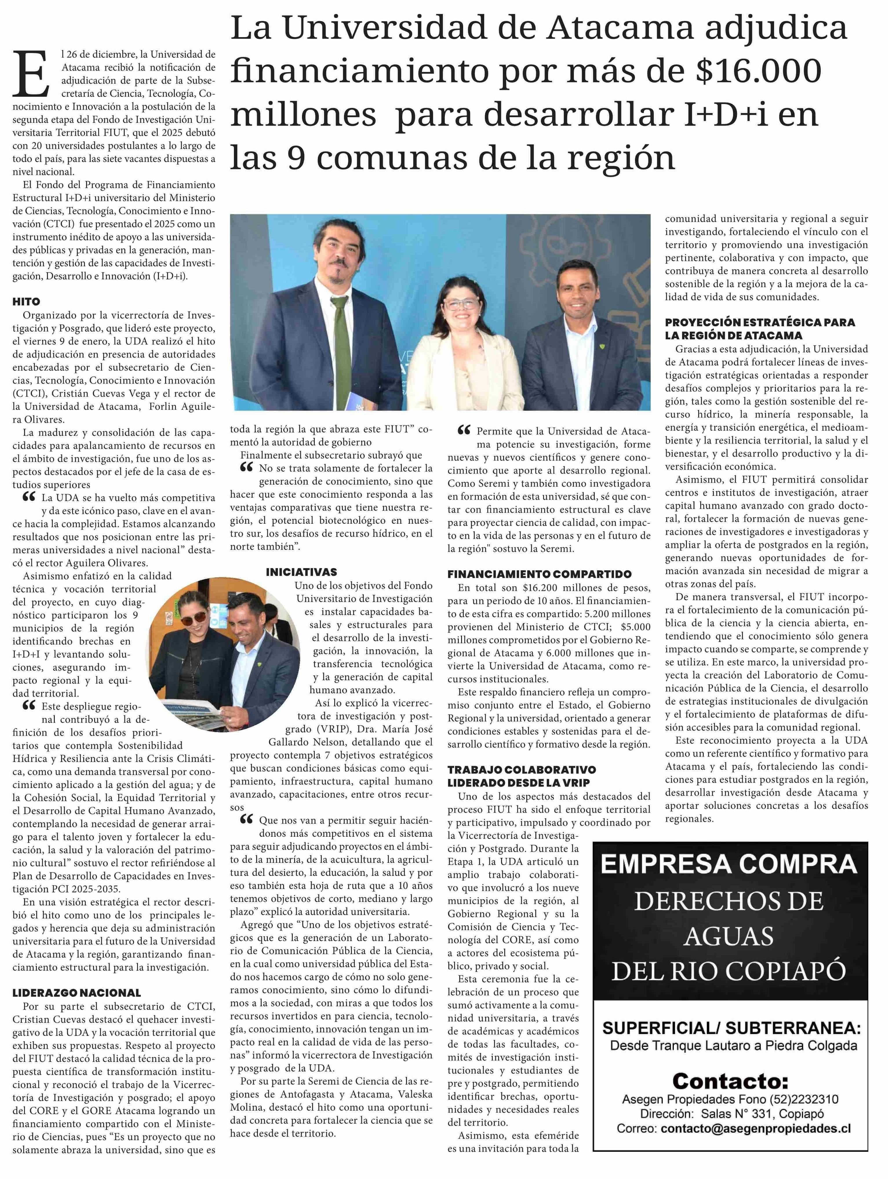 La Universidad de Atacama adjudica financiamiento por más de $16.000 millones para desarrollar I+D+i en las 9 comunas de la región 10-01-2026 Diario Chañarcillo |