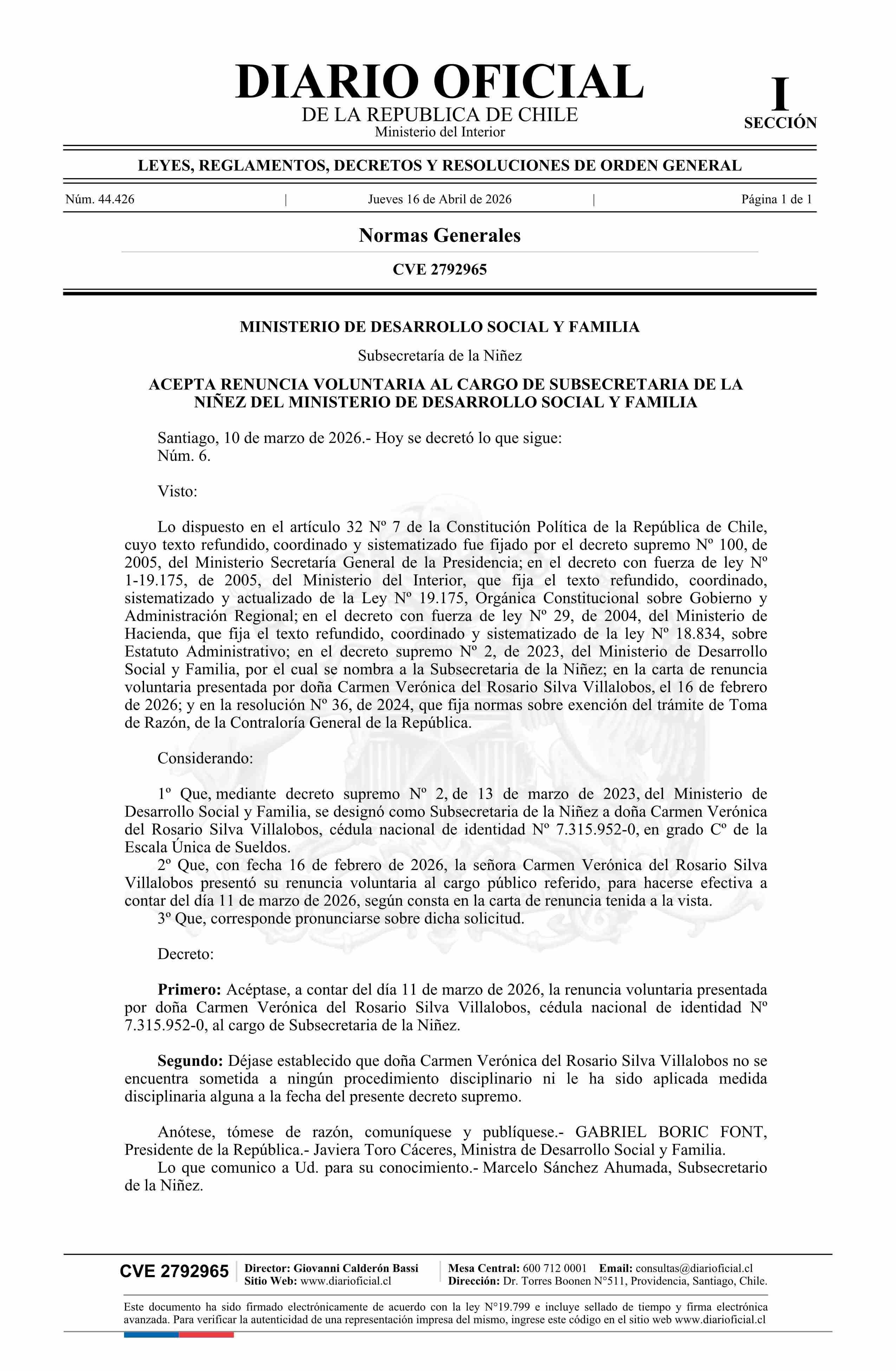 Decreto número 6, de 2026.- Acepta renuncia voluntaria de doña Carmen Verónica del Rosario Silva Villalobos al cargo de Subsecretaria de la Niñez 16-04-2026 Diario Oficial Edición Electrónica |