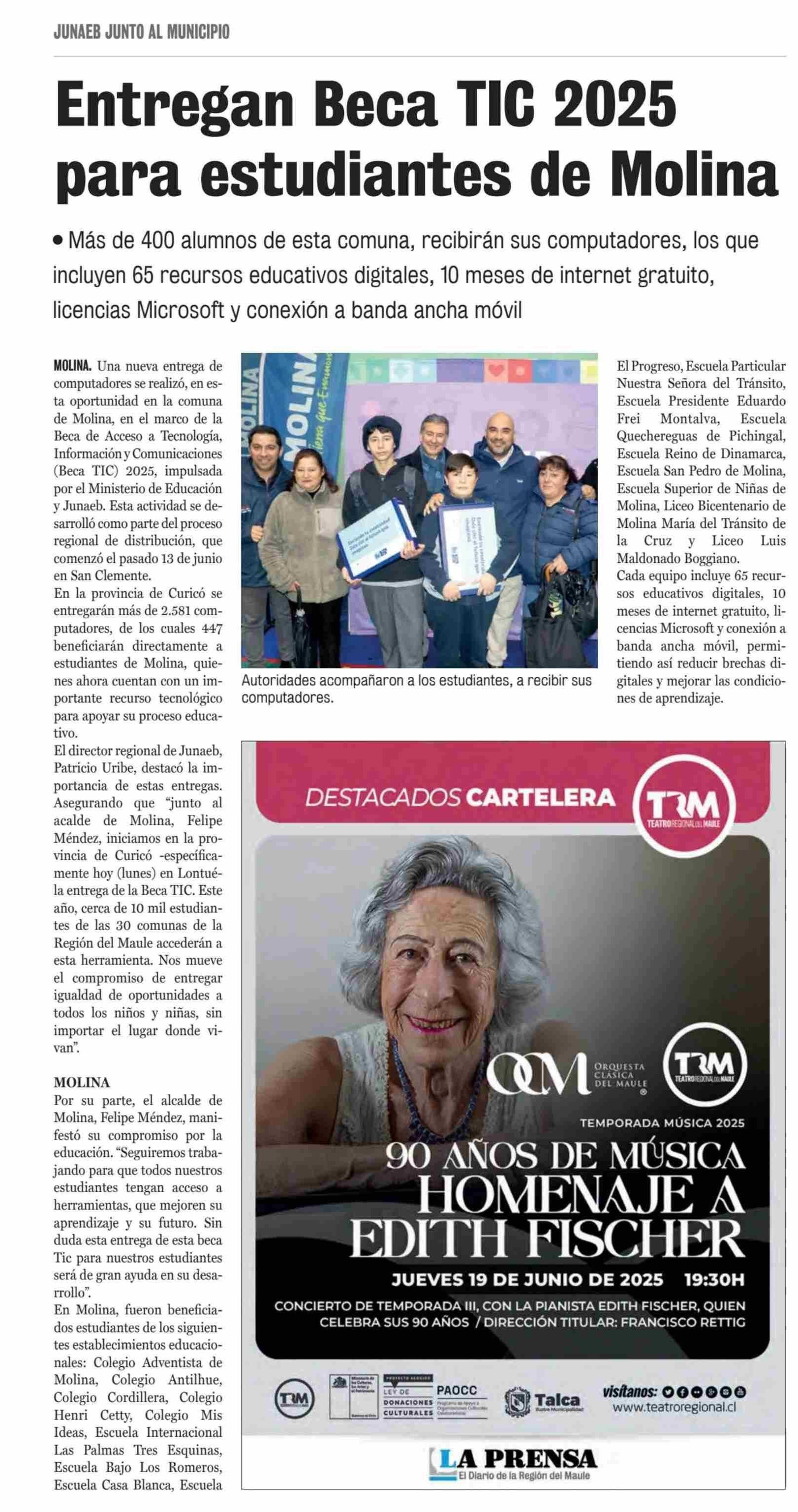 Entregan Beca TIC 2025 vara estudiantes de Molina 17-06-2025 La Prensa de Curicó |