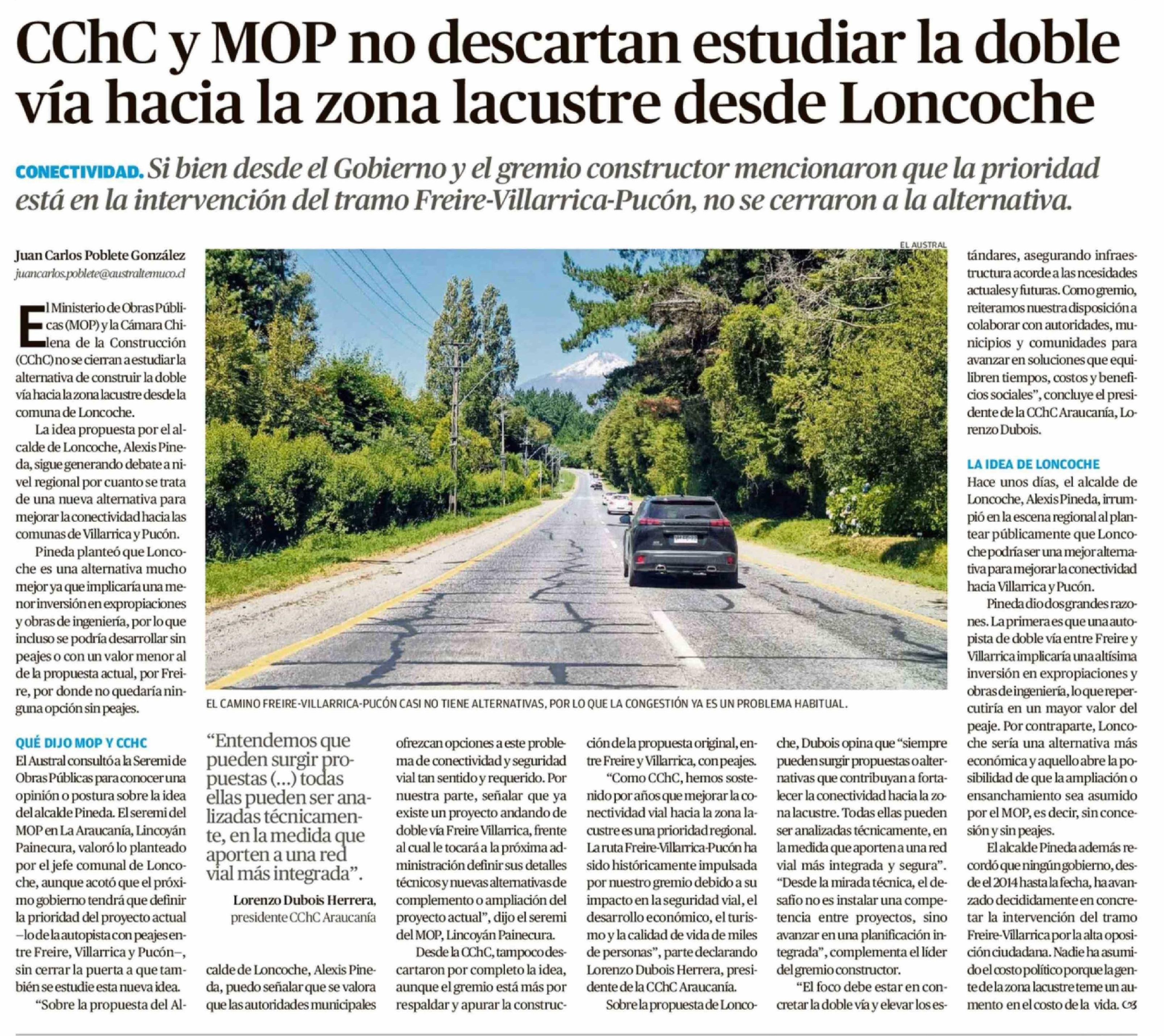 Título: CChC y MOP no descartan estudiar la doble vía hacia la zona lacustre desde Loncoche