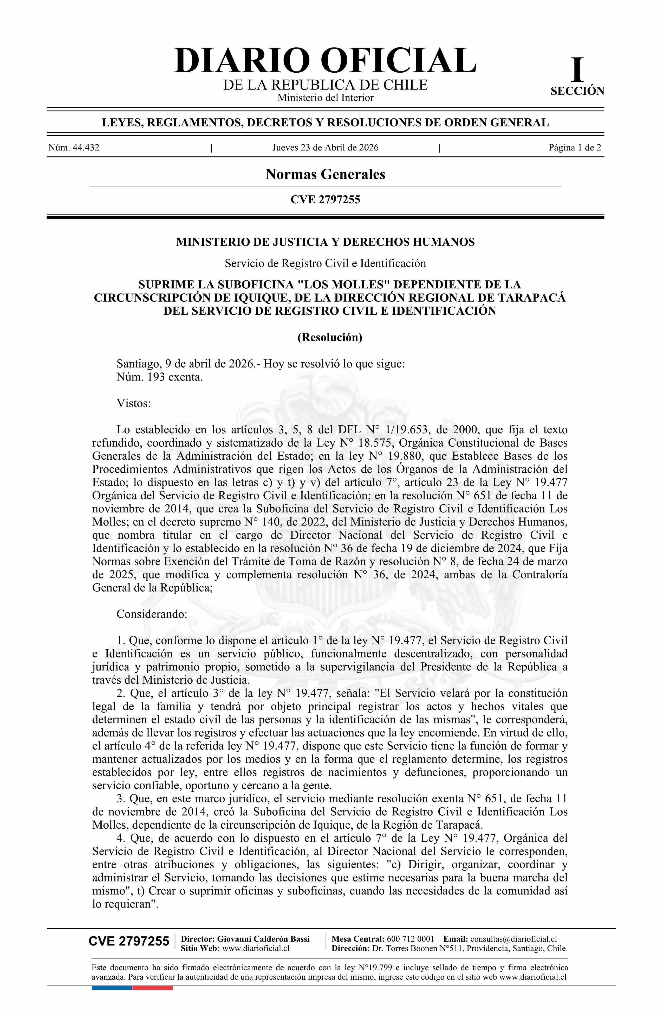 Resolución exenta número 193, de 2026.- Suprime la Suboficina Los Molles dependiente de la circunscripción de Iquique, de la Dirección Regional de Tarapacá 23-04-2026 Diario Oficial Edición Electrónica |