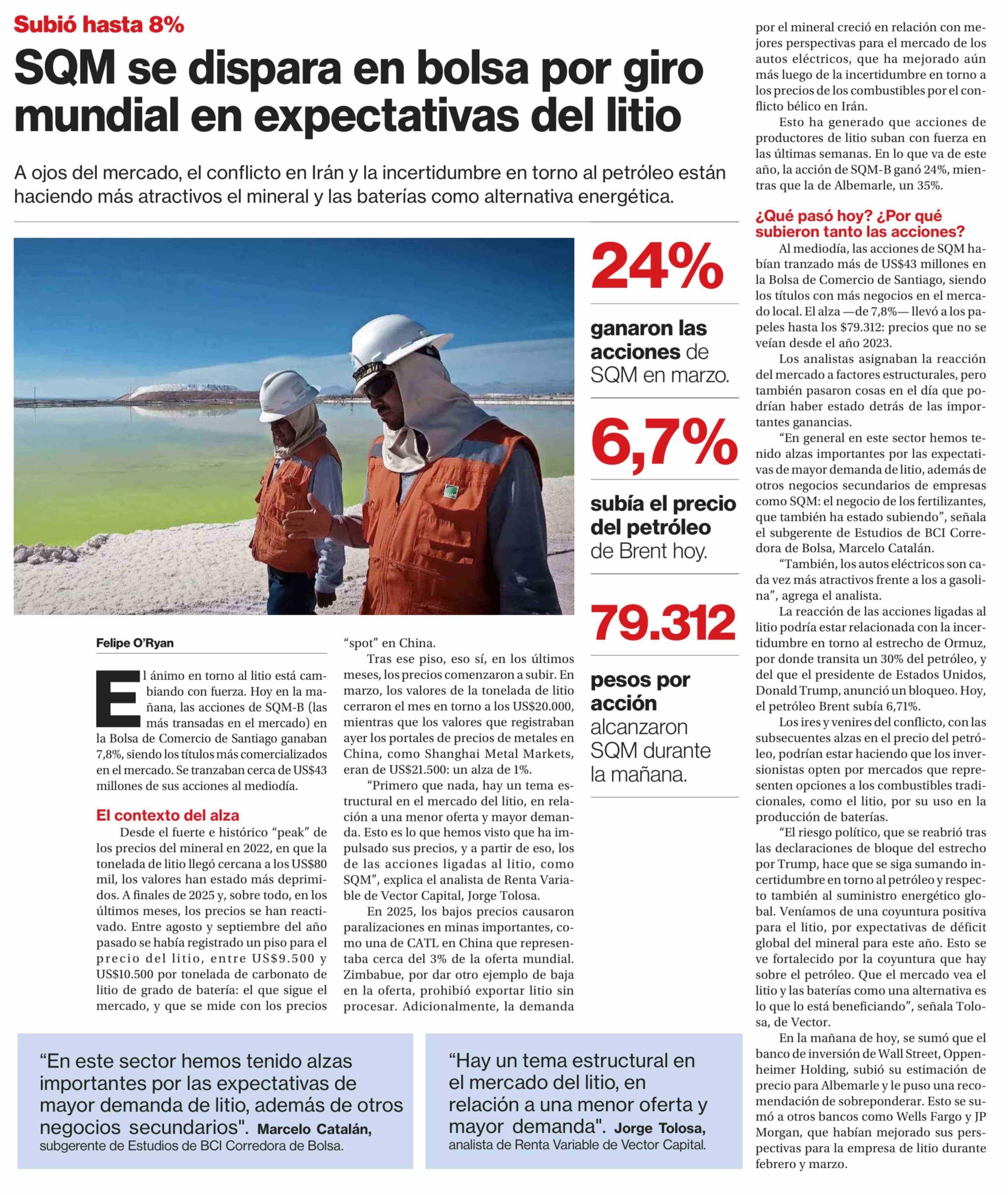 SQM se dispara en bolsa por giro mundial en expectativas del litio 13-04-2026 La Segunda |