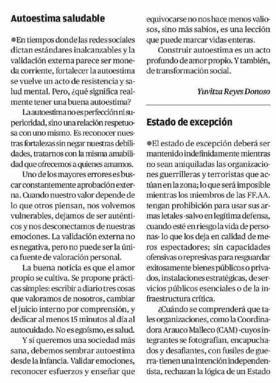 CARTAS: Autoestima saludable 22-06-2025 El Mercurio de Calama |