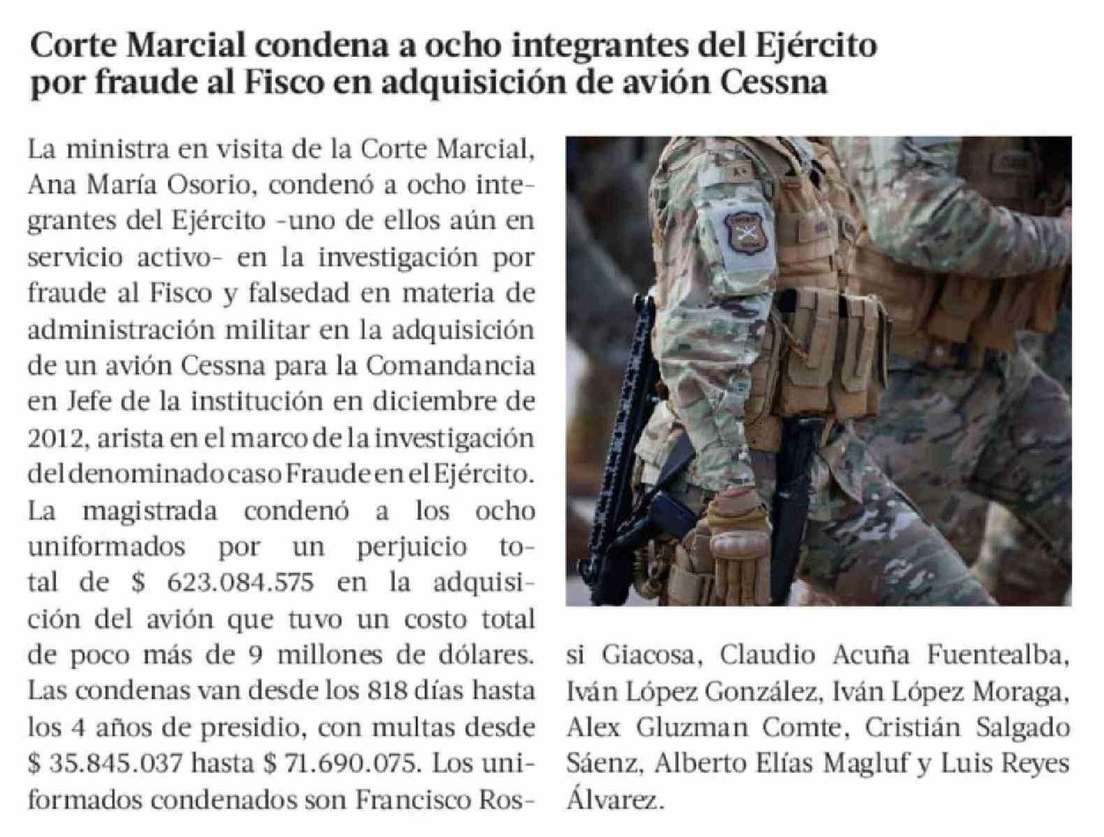 Corte Marcial condena a ocho integrantes del Ejército por fraude al Fisco en adquisición de avión Cessna 03-04-2026 La Tercera |