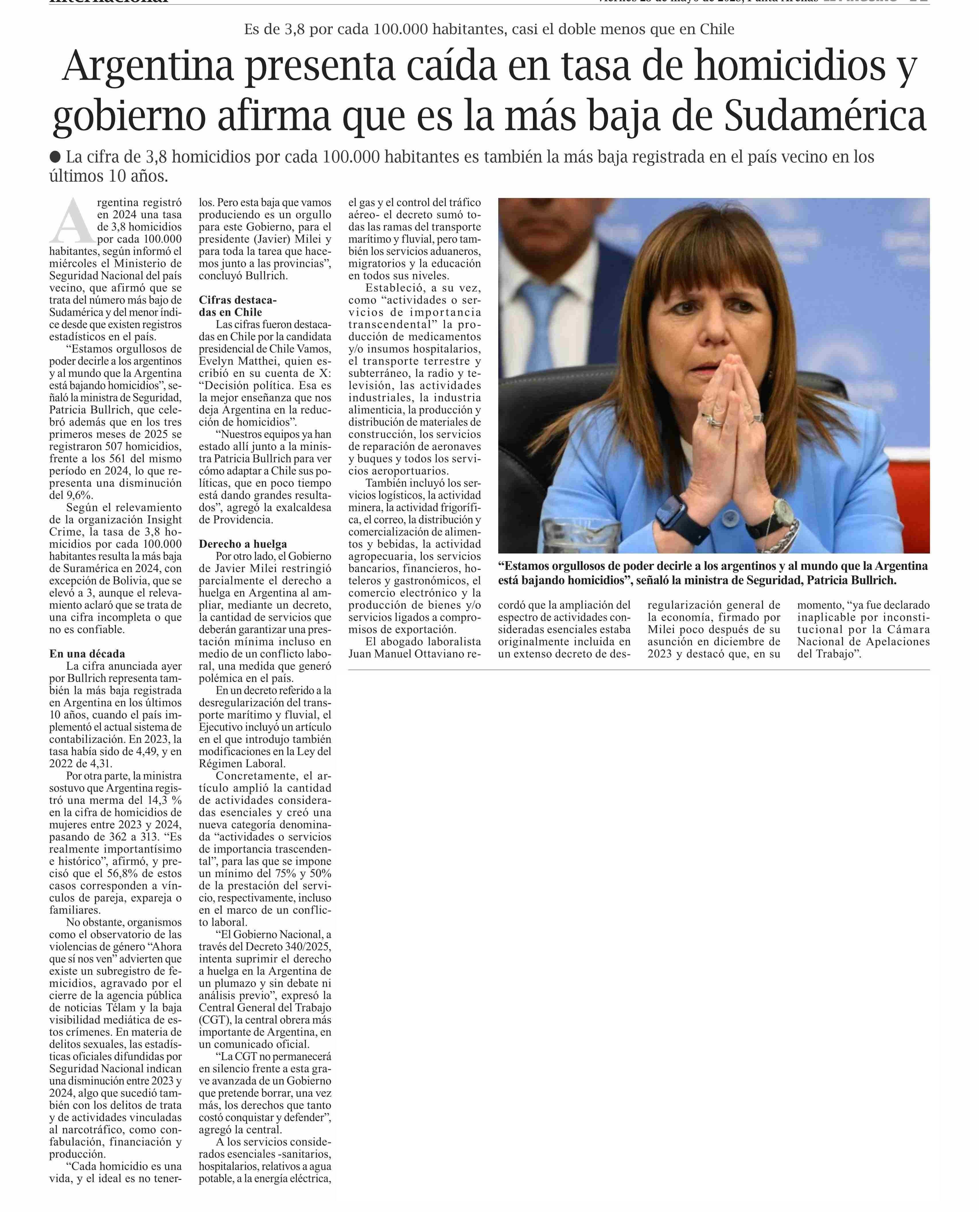 Argentina presenta caída en tasa de homicidios y gobierno afirma que es la más baja de Sudamérica 23-05-2025 El Pingüino |