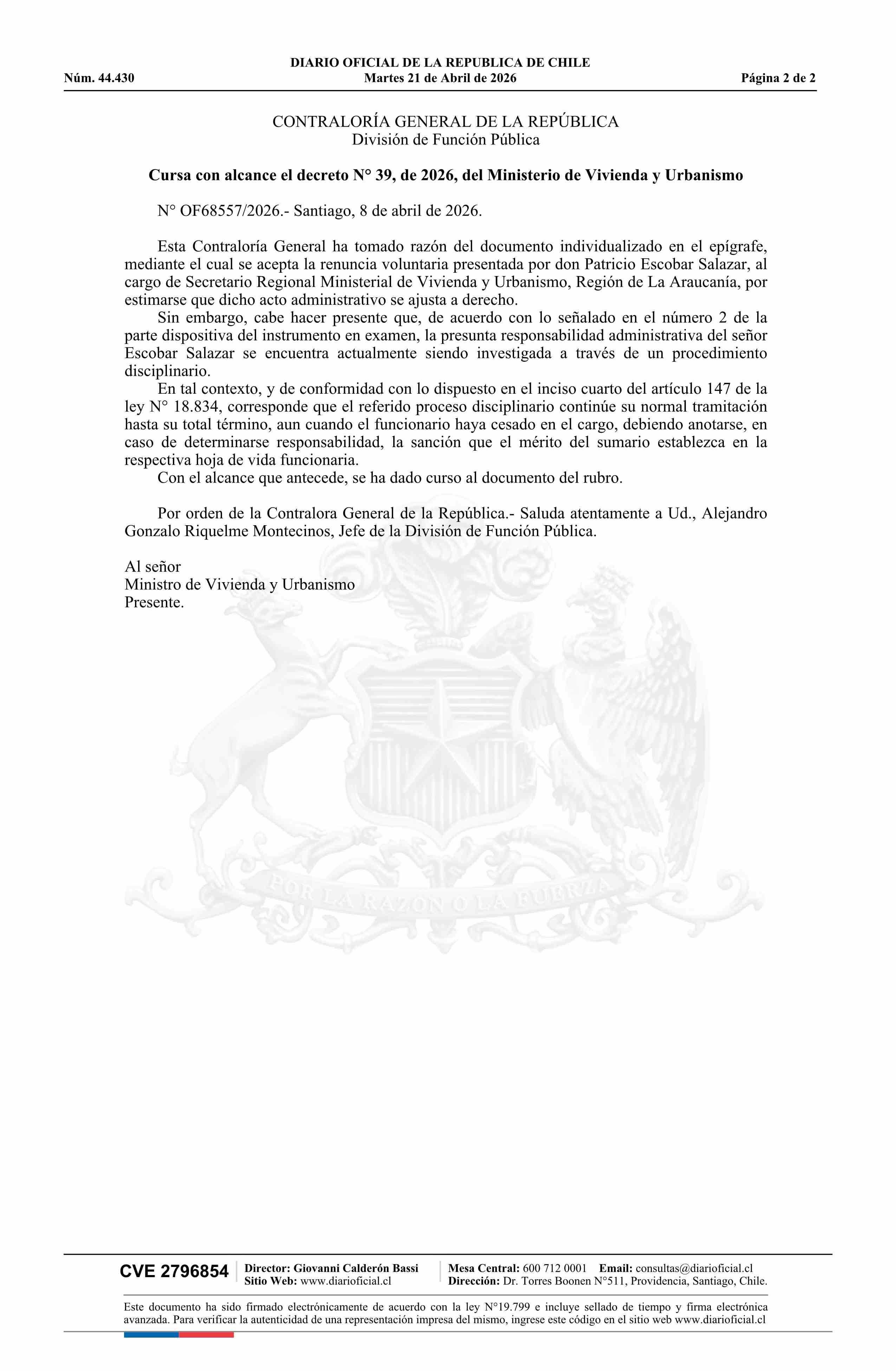 | Título: | Decreto número 39, de 2026.- Acepta renuncia voluntaria de don Patricio Andrés Escobar Salazar al cargo de Secretario Regional Ministerial de la Región de La Araucanía |