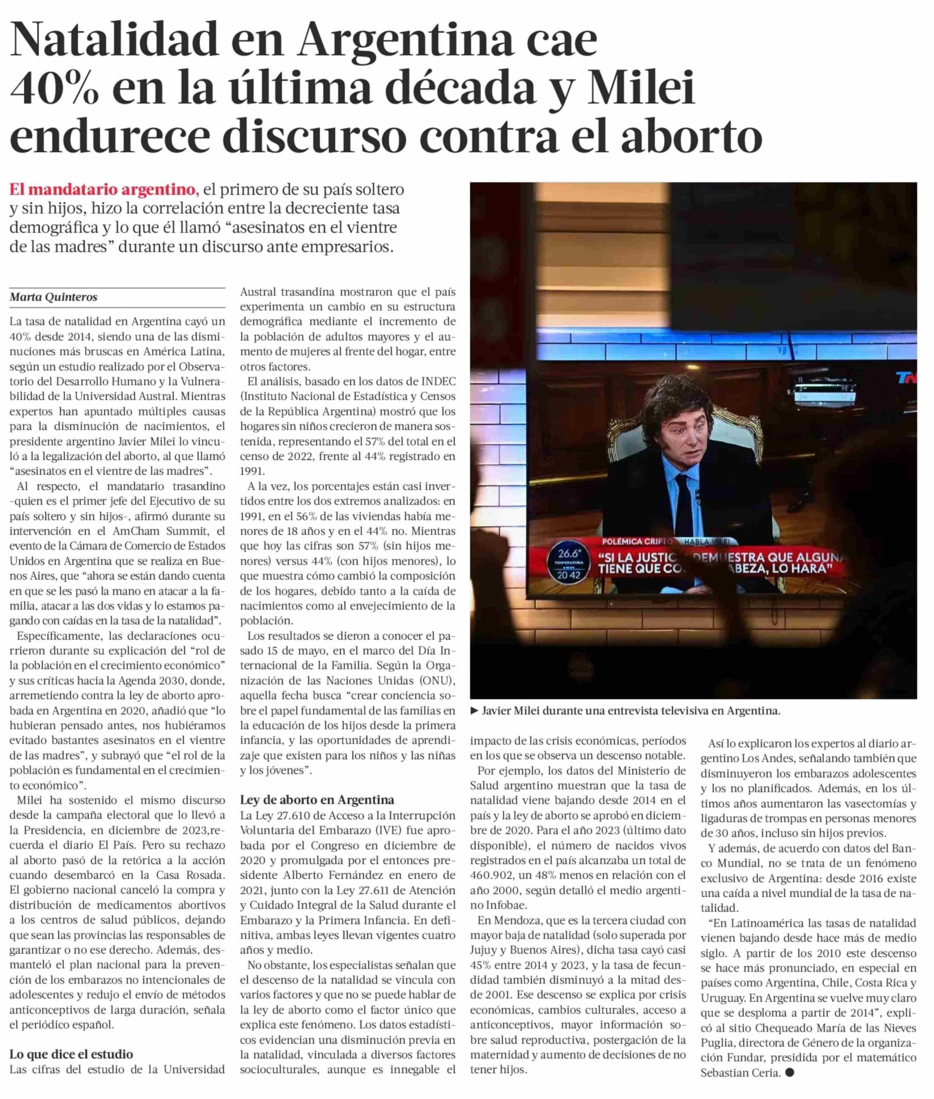 Natalidad en Argentina cae 40% en la última década y Milei endurece discurso contra el aborto 28-05-2025 La Tercera |