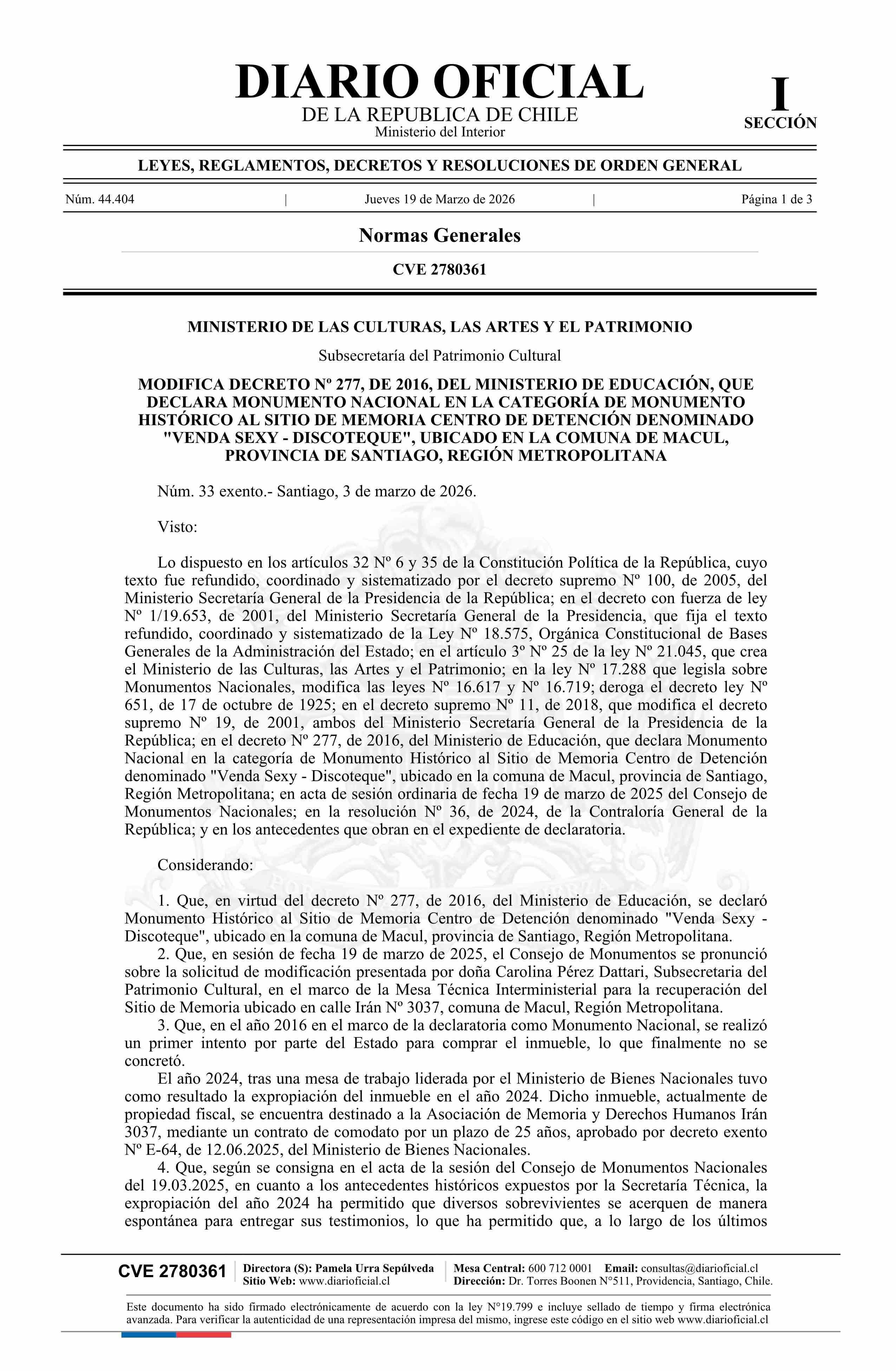 | Título: | Decreto exento número 33, de 2026.- Modifica decreto Nº 277, de 2016, del Ministerio de Educación, que declara Monumento Nacional en la categoría de Monumento Histórico al Sitio de Memoria Centro de Detención denominado Venda Sexy - Discoteque, ubicado en la comuna de Macul, provincia de Santiago, R |