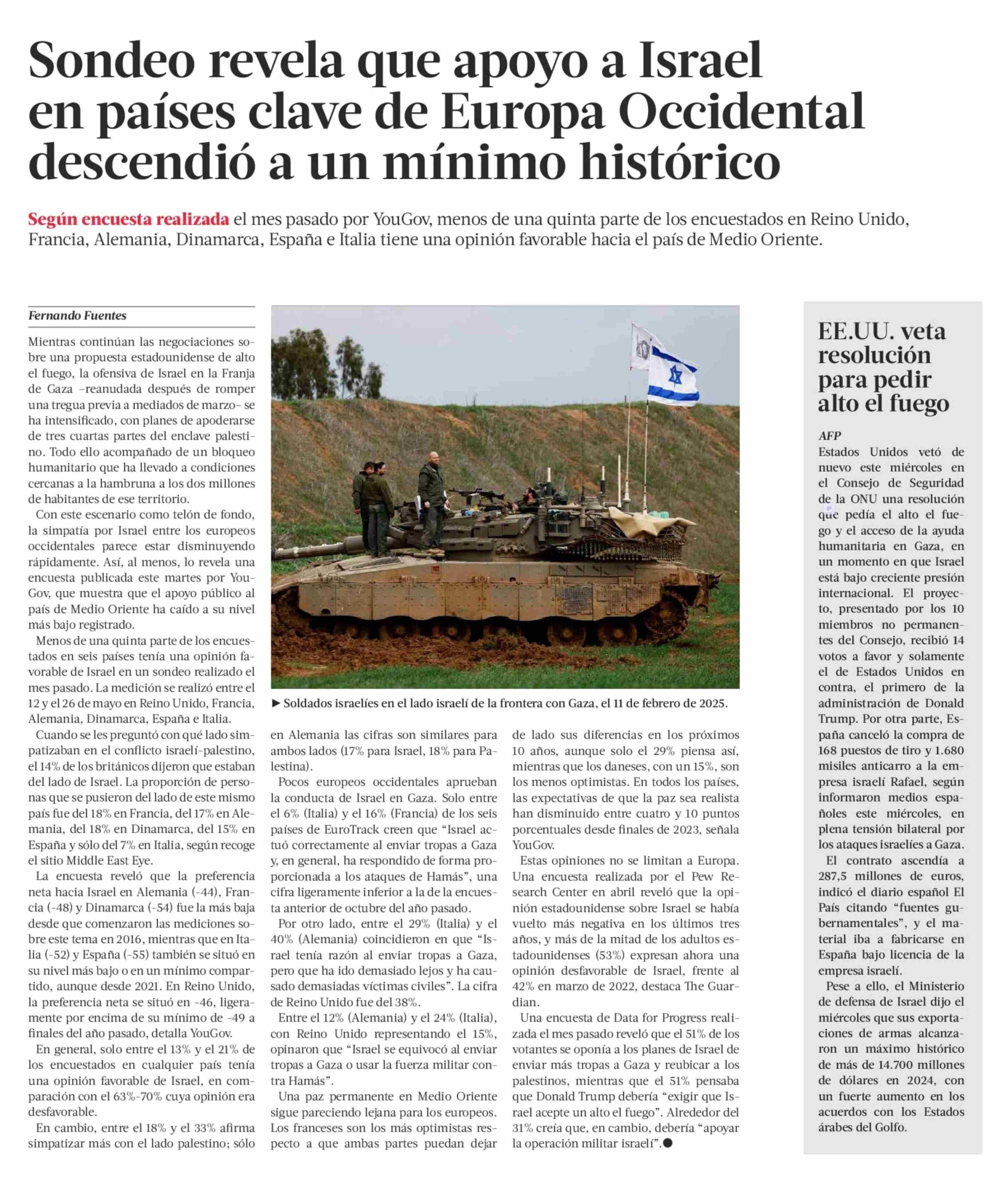 | Título: | Sondeo revela que apoyo a Israel en países clave de Europa Occidental descendió a un mínimo histórico |