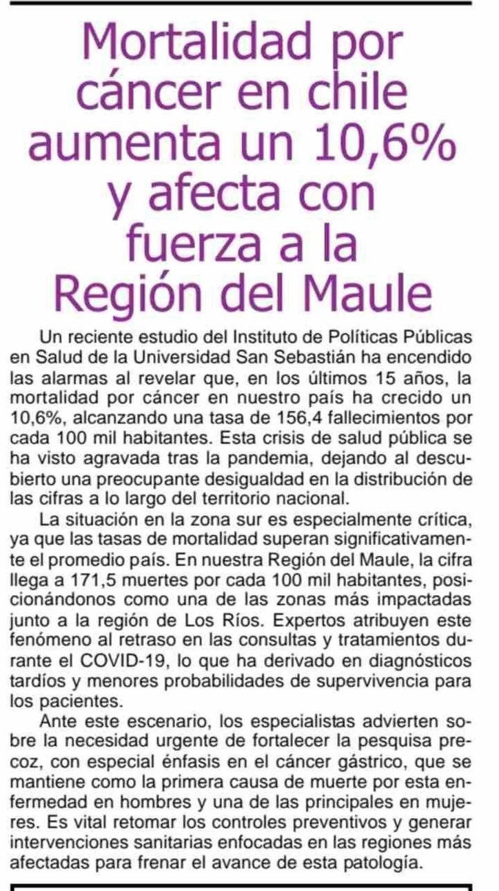 Título: Mortalidad por cáncer en chile aumenta un 10,6% y afecta con fuerza a la Región del Maule