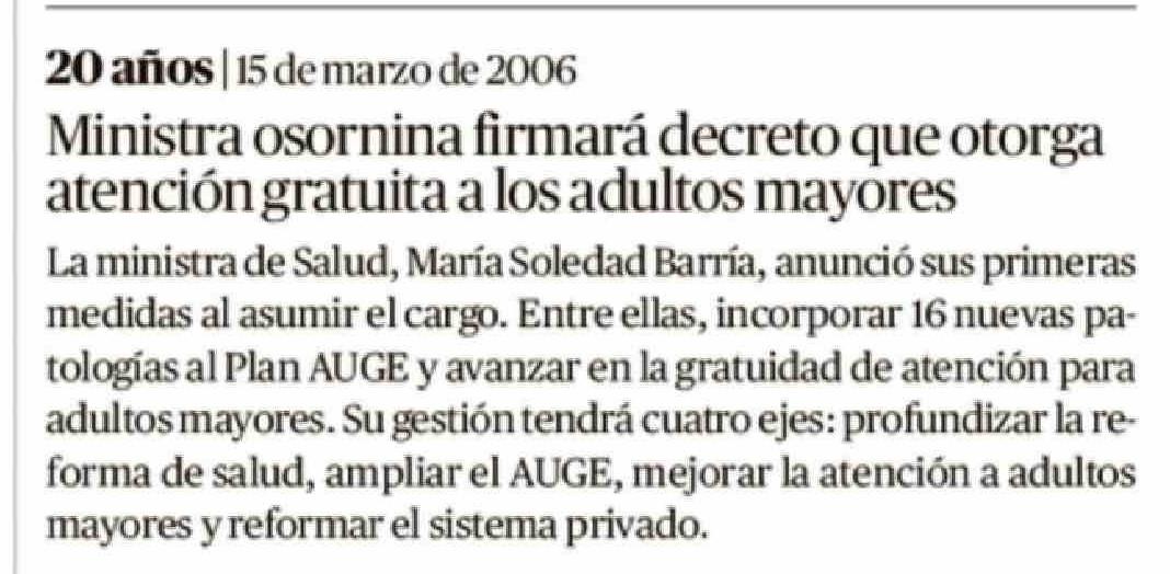 | Título: | 20 años | 15 de marzo de 2006 Ministra osornina firmará decreto que otorga atención gratuita a los adultos mayores La ministra de Salud, María Soledad Barría, anunció sus primeras medidas al asumir el cargo. Entre ellas, incorporar 16 nuevas patologías al Plan AUGE y avanzar en la gratuidad de atenc |