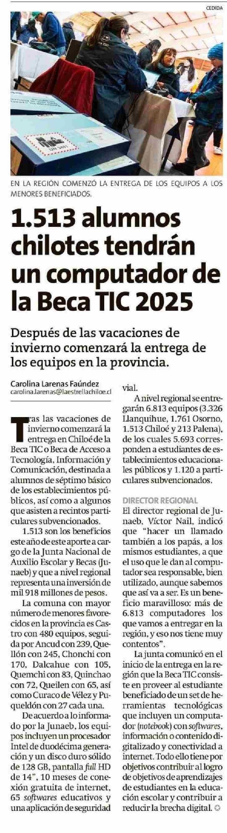 1.513 alumnos chilotes tendrán computador de la Beca TIC 2025 19-06-2025 La Estrella de Chiloé |