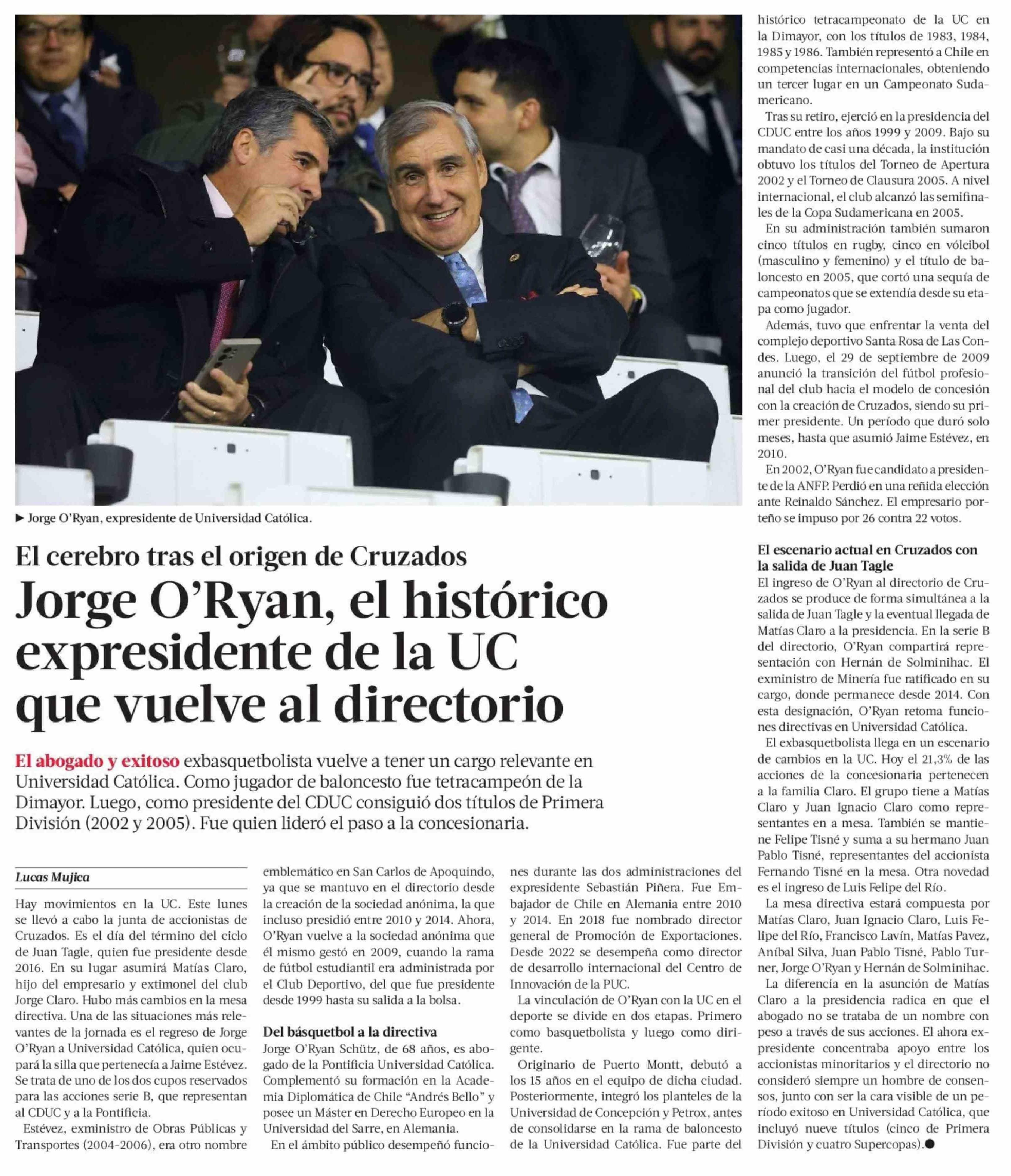 Título: Jorge O'Ryan, el histórico expresidente de la UC que vuelve al directorio