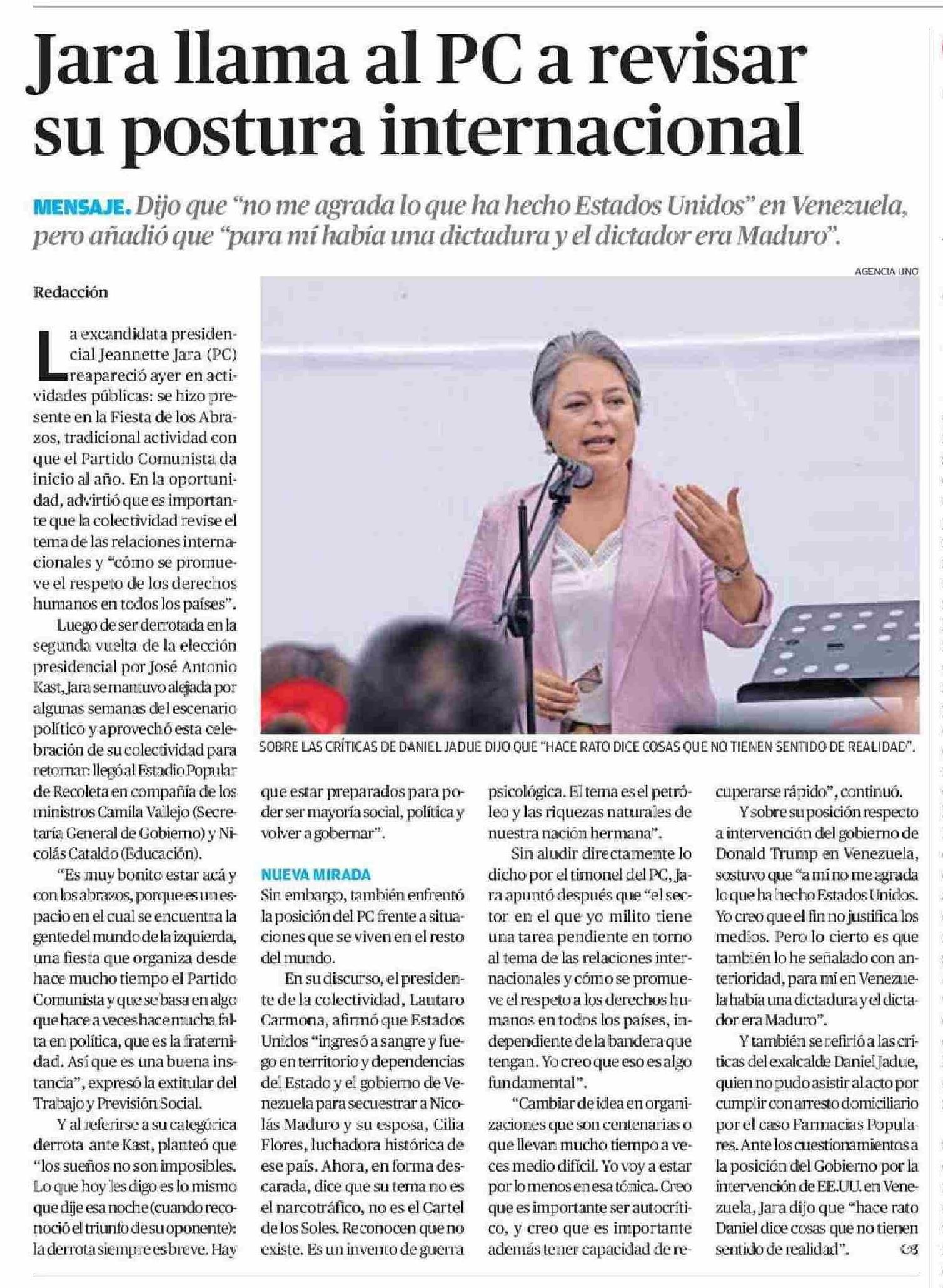 Jara llama al PC a revisar su postura internacional 11-01-2026 El Mercurio de Calama |