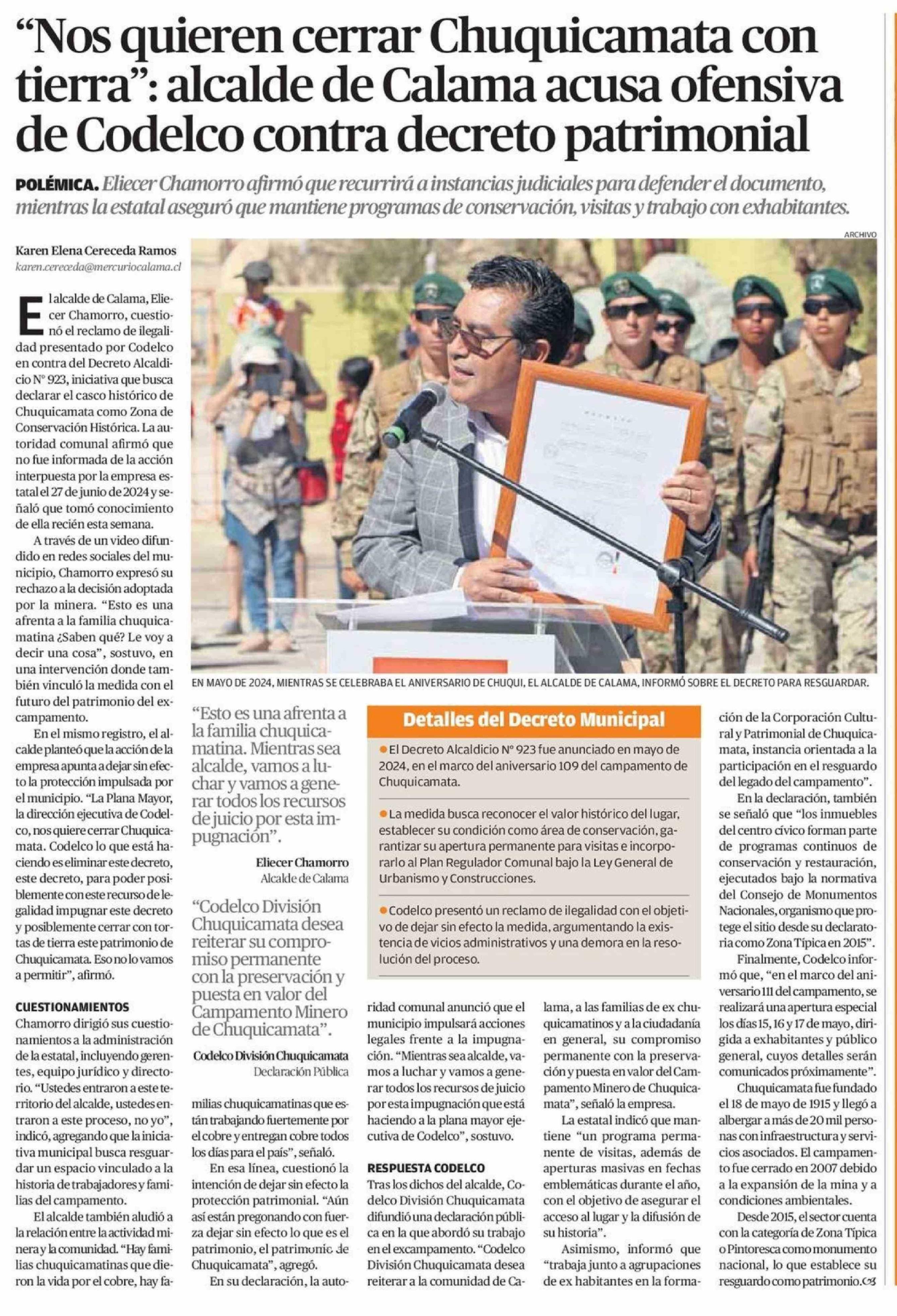 Título: "Nos quieren cerrar Chuquicamata con tierra": alcalde de Calama acusa ofensiva de Codelco contra decreto patrimonial