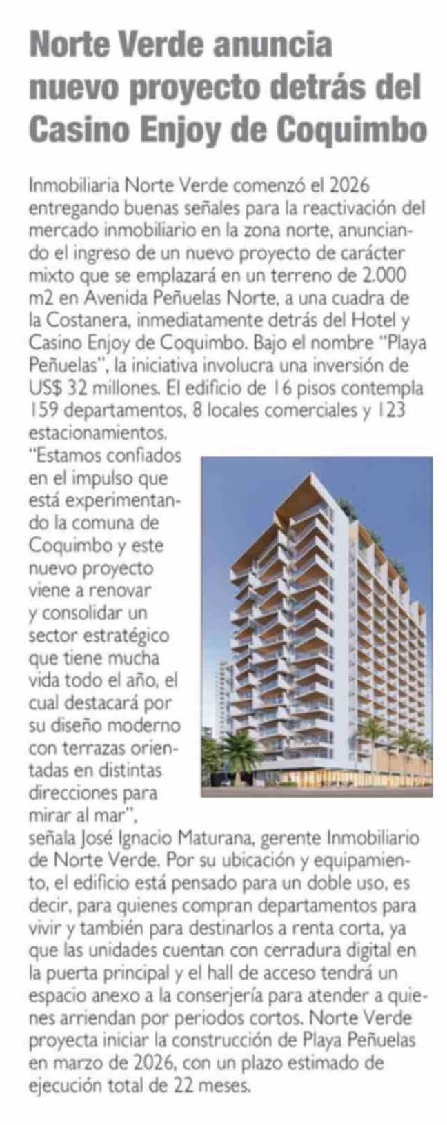 Norte Verde anuncia nuevo proyecto detrás del Casino Enjoy de Coquimbo 16-02-2026 Las Últimas Noticias |