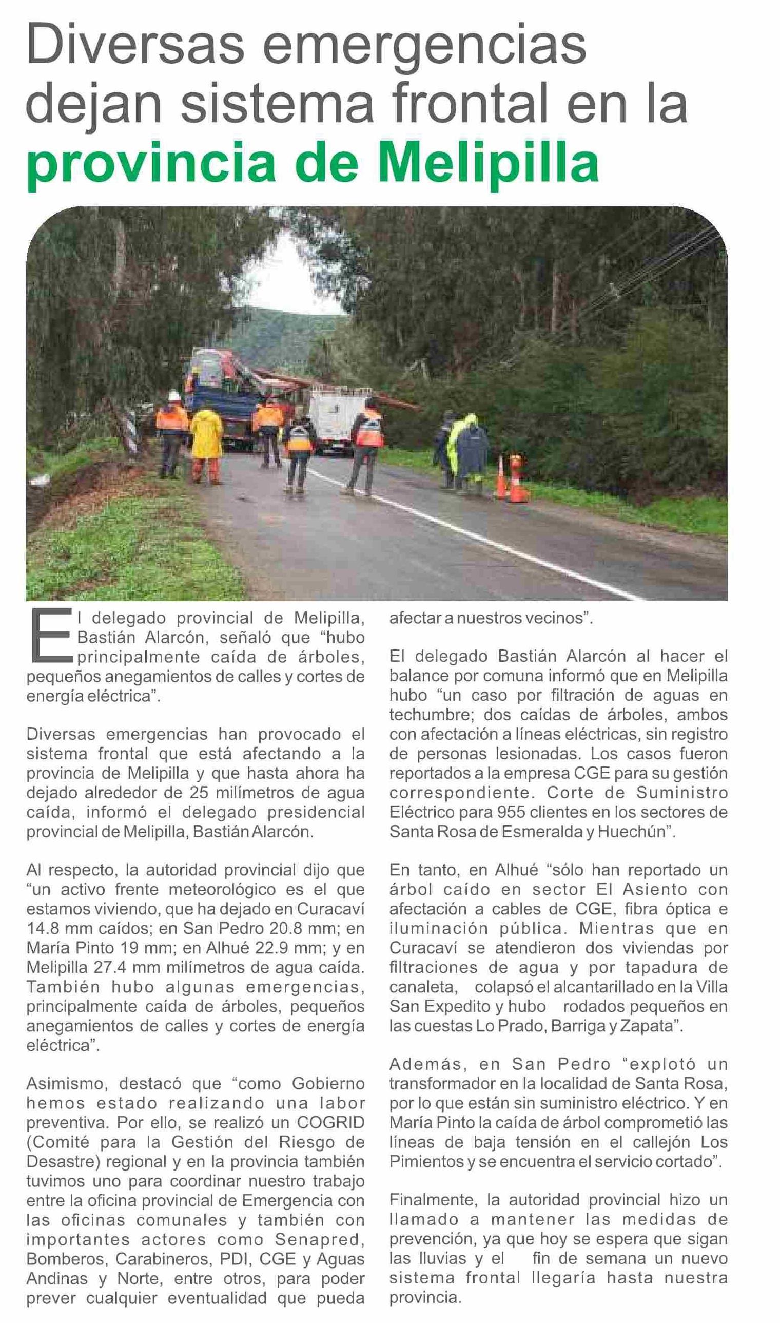 | Título: | Diversas emergencias dejan sistema frontal en la provincia de Melipilla |