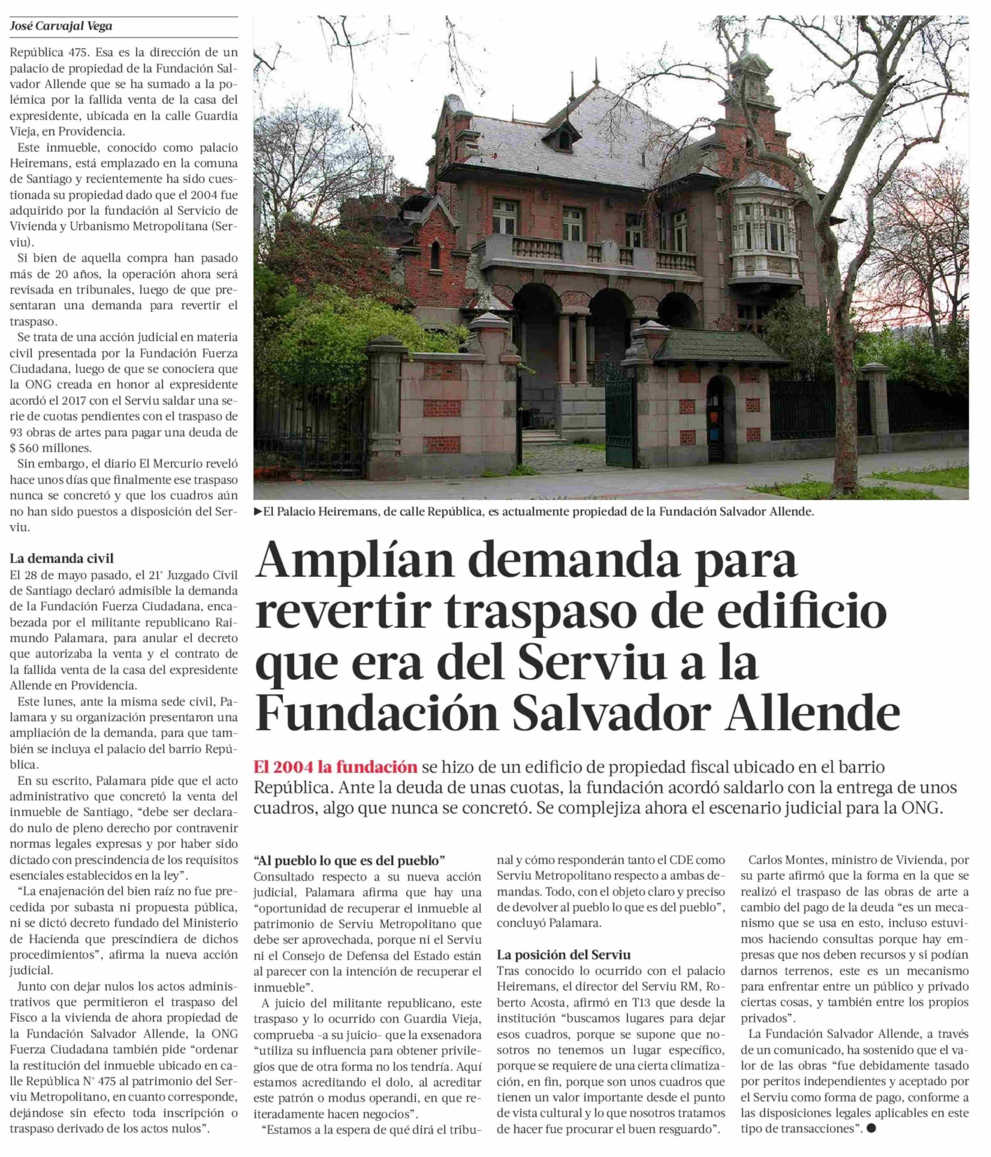 Amplían demanda para revertir traspaso de edificio que era del Serviu a la Fundación Salvador Allende 10-06-2025 La Tercera |