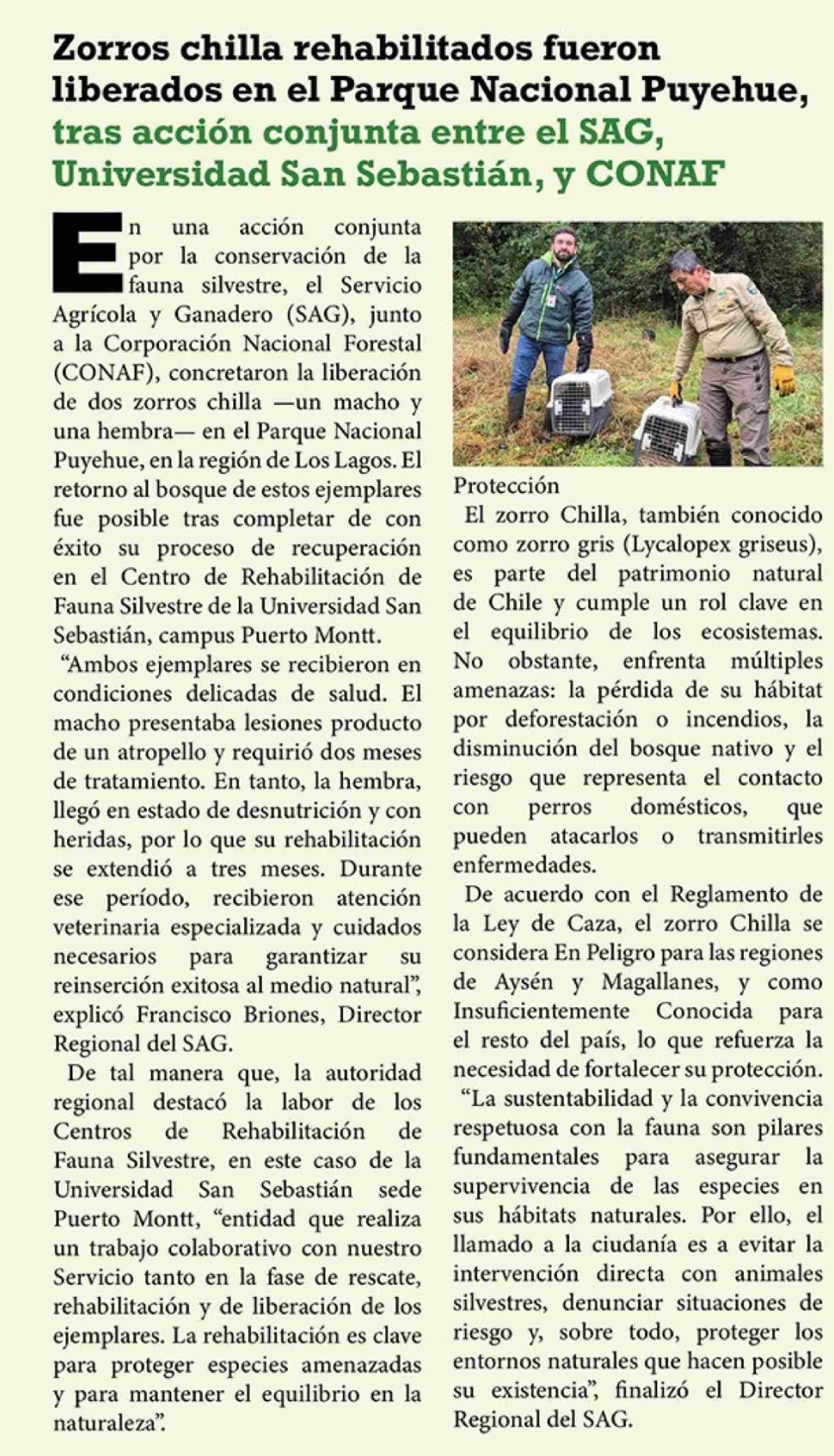 Zorros chilla rehabilitados fueron liberados en el Parque Nacional Puyehue, tras acción conjunta entre el SAG, Universidad San Sebastián, y CONAF 19-06-2025 El Heraldo Austral |