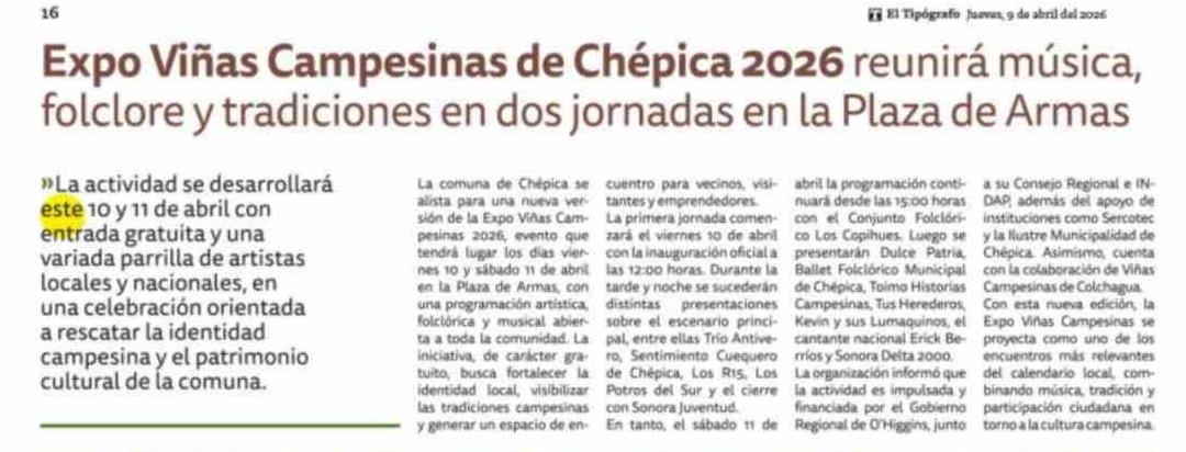 Título: Expo Viñas Campesinas de Chépica 2026 reunirá música, folclore y tradiciones en dos jornadas en la Plaza de Armas