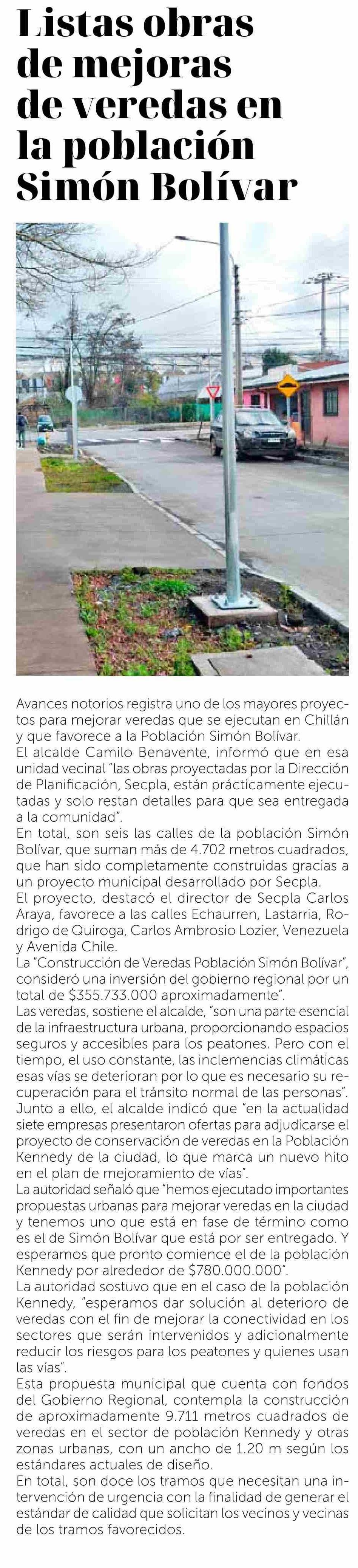 | Título: | Listas obras de mejoras de veredas en la población Simón Bolívar |