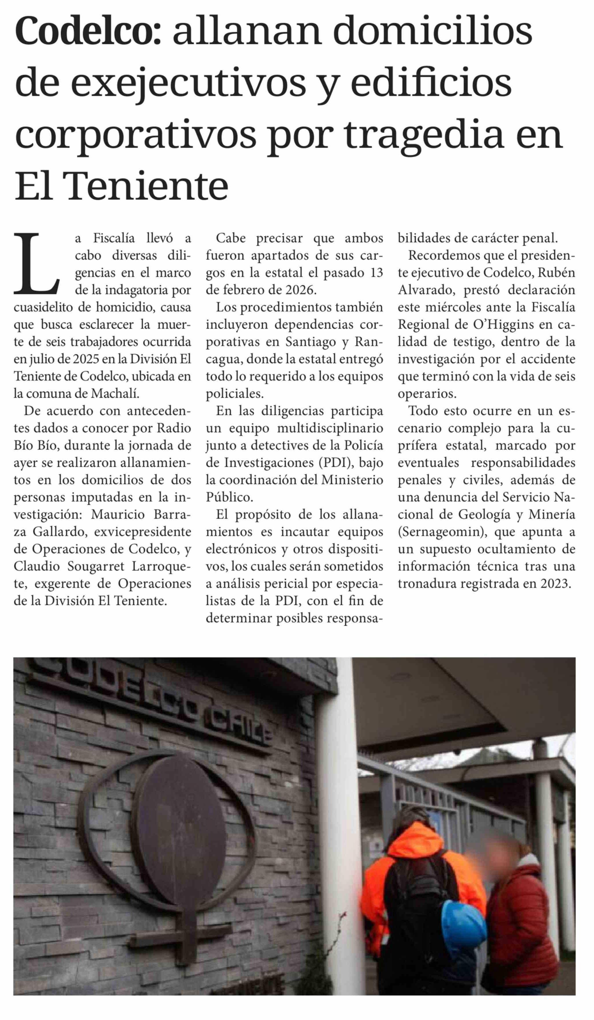 Título: Codelco: allanan domicilios de exejecutivos y edificios corporativos por tragedia en El Teniente