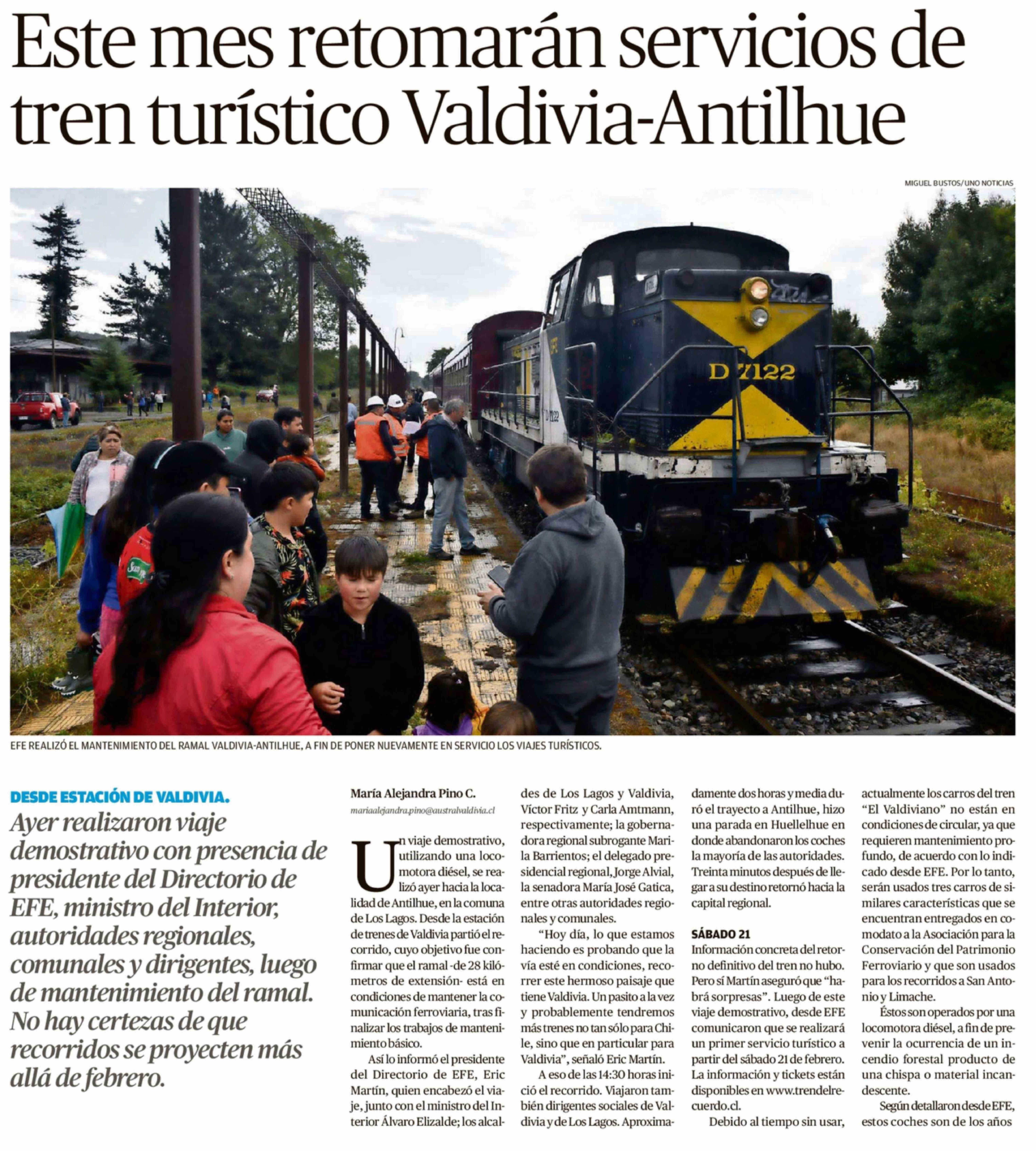 Este mes retomarán servicios de tren turístico Valdivia-Antilhue 11-02-2026 Diario Austral Región de Los Ríos |