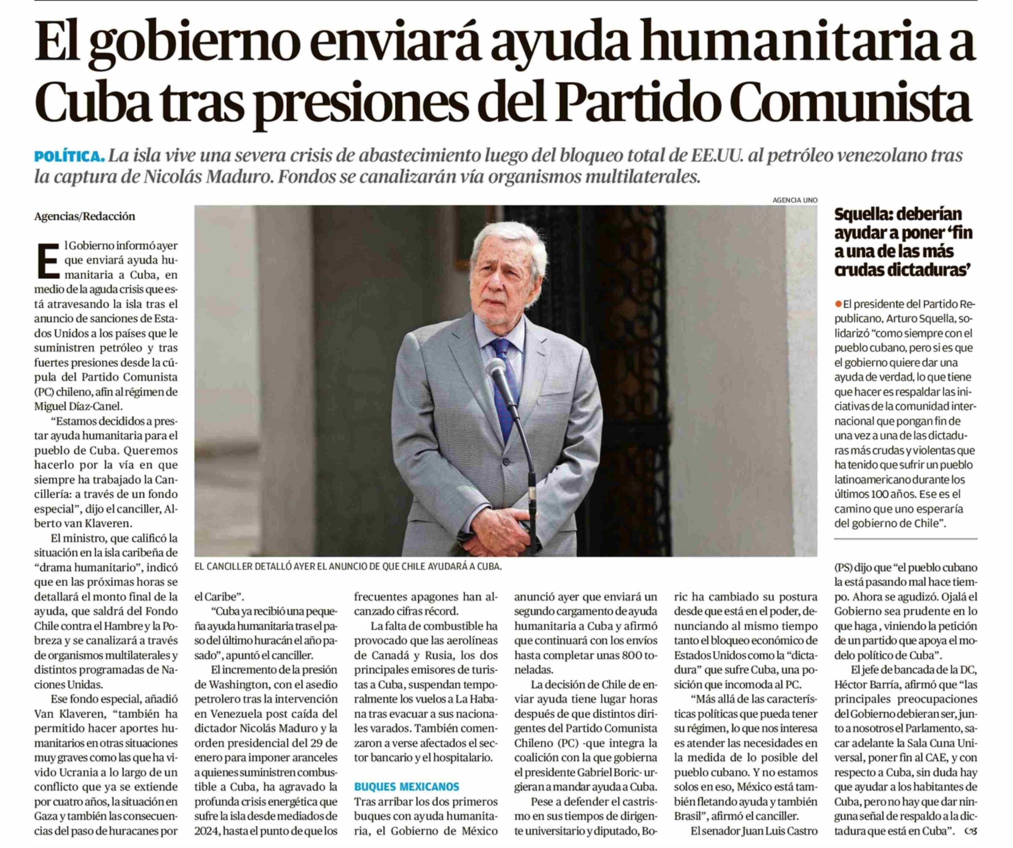 El gobierno enviará ayuda humanitaria a Cuba tras presiones del Partido Comunista 13-02-2026 Diario Austral Región de Los Ríos |
