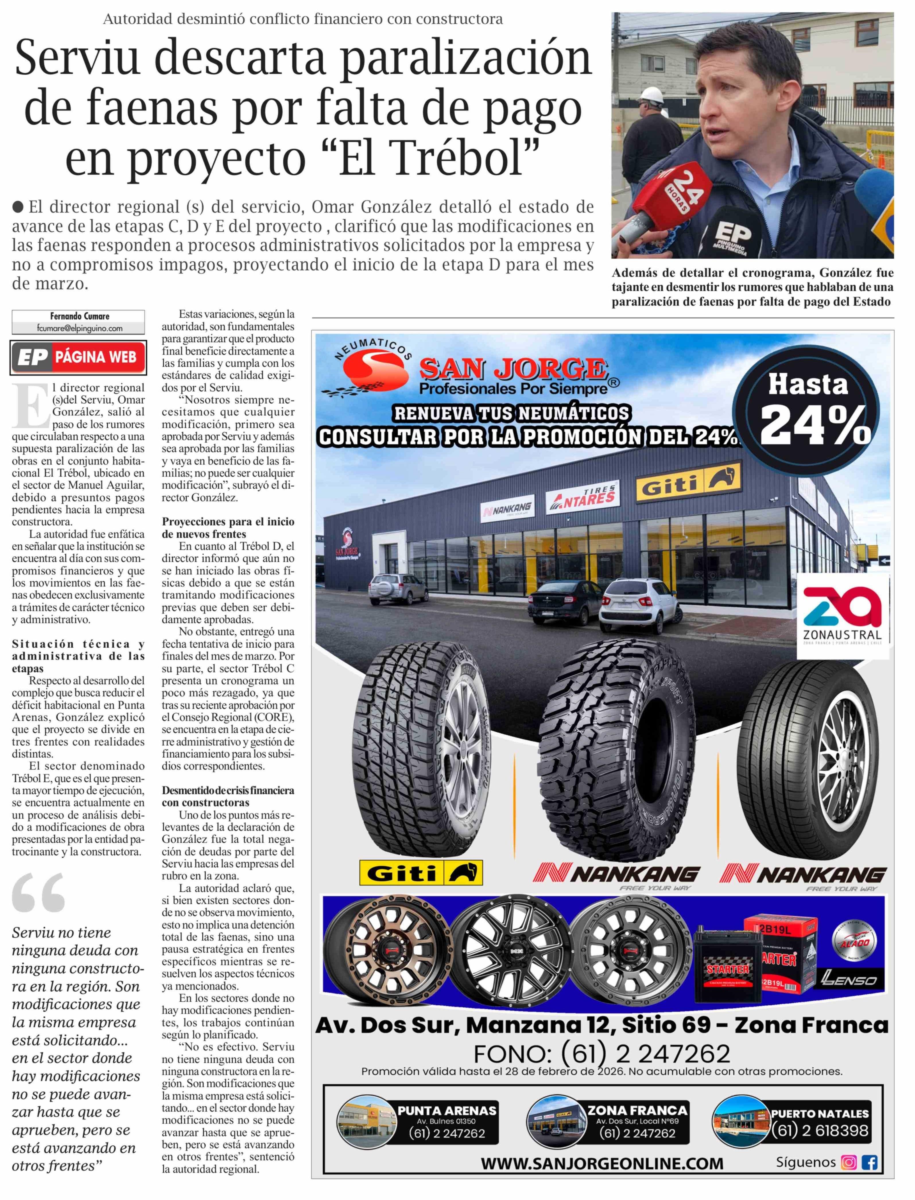 Serviu descarta paralización de faenas por falta de pago en proyecto "El Trébol" 13-02-2026 El Pingüino |